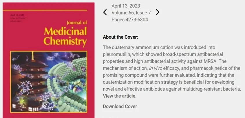 近日,食品科學(xué)與工程學(xué)院(生物與醫(yī)藥學(xué)院)梁承遠(yuǎn)教授課題組與廣東醫(yī)科大學(xué)附屬醫(yī)院夏娟博士合作,在抗多藥耐藥菌小分子藥物研發(fā)方面取得最新研究成果,以題為“Discovery of Quaternized Pyridine-Thiazole-Pleuromutilin Derivatives with Broad-Spectrum Antibacterial and Potent Anti-MRSA Activity”作為封面文章發(fā)表在最新一期藥物化學(xué)領(lǐng)域頂級(jí)期刊Journal of Medicinal Chemistry。