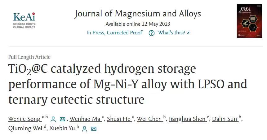 近日,我校機(jī)電工程學(xué)院宋文杰副教授團(tuán)隊(duì)在鎂合金領(lǐng)域國(guó)際頂級(jí)期刊Journal of Magnesium and Alloys(1/79,中科院一區(qū),影響因子11.862)在線發(fā)表題為《TiO2@C catalyzed hydrogen storage performance of Mg-Ni-Y alloy with LPSO and ternary eutectic structure》的高水平文章,宋文杰為第一作者兼共同通訊作者,研究生馬文豪為第二作者,陜西科技大學(xué)為第一完成單位,該論文的發(fā)表極大地提高了我校在鎂基固態(tài)儲(chǔ)氫材料領(lǐng)域的影響力。
