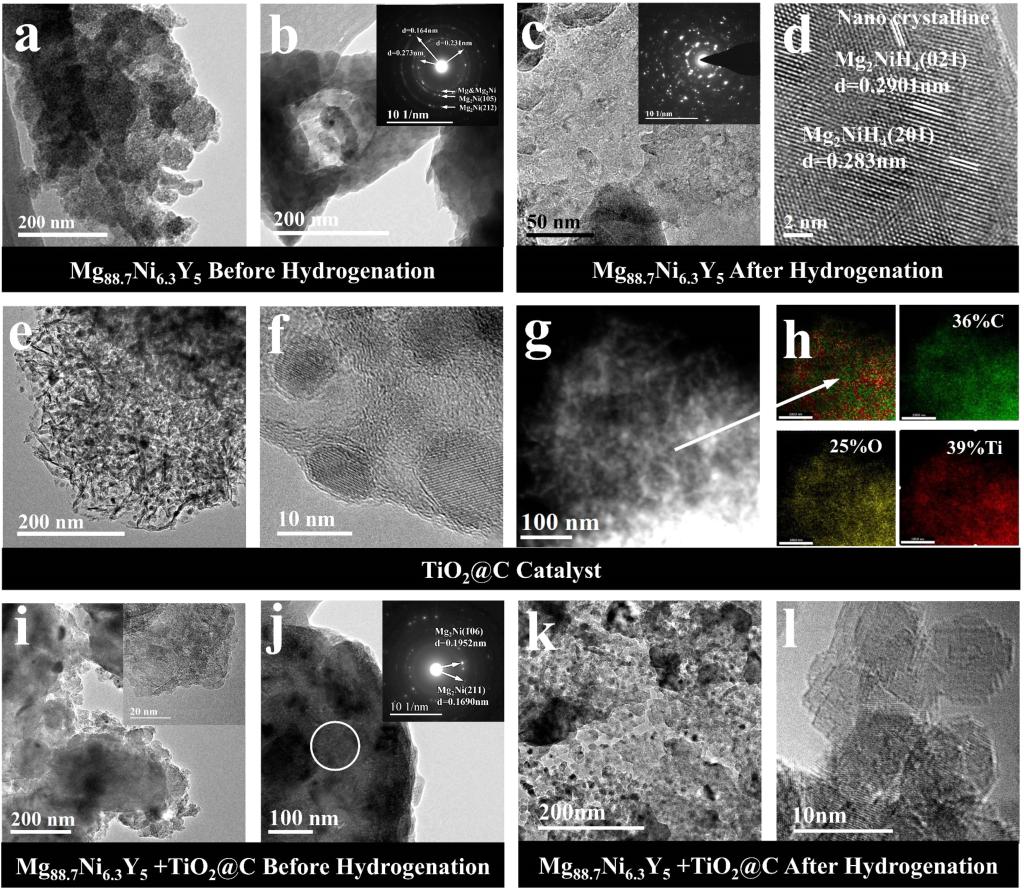宋文杰團(tuán)隊(duì)通過(guò)合金成分設(shè)計(jì),制備了一種含有14H型LPSO(長(zhǎng)周期堆積有序)結(jié)構(gòu)和三元共晶組織的Mg-Ni-Y儲(chǔ)氫合金。通過(guò)增加內(nèi)部擴(kuò)散通道、內(nèi)部原位自生和外加添加納米催化劑進(jìn)行協(xié)同催化,顯著提高了合金的儲(chǔ)氫性能。氫化過(guò)程中LPSO結(jié)構(gòu)的分解導(dǎo)致了大量納米晶體的形成,提供了豐富的相邊界和活化點(diǎn)。納米級(jí)的TiO2@C催化劑均勻地分散在合金顆粒的表面,TiO2@C的“氫泵”效應(yīng)加速了氫氣在合金顆粒表面的解離和擴(kuò)散。鎂基固態(tài)儲(chǔ)氫材料可逆儲(chǔ)氫量為5.32wt.%,開(kāi)始放氫溫度降低至200℃,在200℃和30bar條件下,1分鐘內(nèi)達(dá)到4.25wt.%的吸氫量。團(tuán)隊(duì)的研究工作為鎂基固態(tài)儲(chǔ)氫材料的性能大幅度改善提供了解決方案,有助于推進(jìn)鎂基固態(tài)儲(chǔ)氫材料的商業(yè)化應(yīng)用。