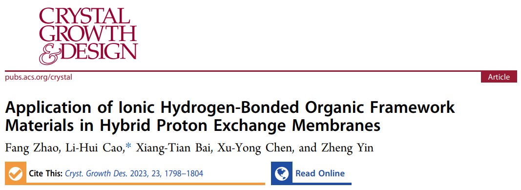 相關(guān)成果以“Application of Ionic Hydrogen-Bonded Organic Framework Materials in Hybrid Proton Exchange Membranes”為題,發(fā)表在Crystal Growth & Design上(IF = 4.010)上。陜西科技大學(xué)為論文唯一通訊單位,化學(xué)與化工學(xué)院2020級(jí)碩士研究生趙芳為該論文的第一作者,曹麗慧教授為第二作者和論文唯一通訊作者。