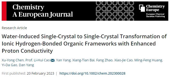 相關(guān)成果以“Water-Induced Single-Crystal to Single-Crystal Transformation of Ionic Hydrogen-Bonded Organic Frameworks with Enhanced Proton Conductivity” 為題,發(fā)表在Chemistry-A European Journal上(IF =5.020)上。陜西科技大學(xué)為論文唯一通訊單位,化學(xué)與化工學(xué)院2021級(jí)博士研究生陳緒永為該論文的第一作者,曹麗慧教授為第二作者和論文唯一通訊作者。