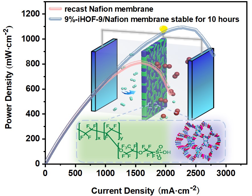 本工作以四(4-磷酸基苯基)甲烷與鹽酸胍為原料,合成了一種基于芳基膦酸鹽陰離子和胍陽(yáng)離子的具有3D氫鍵網(wǎng)絡(luò)的iHOF材料(iHOF-9)。由于iHOF-9中存在固有的分子間氫鍵,使其具有超高質(zhì)子傳導(dǎo)率。在90°C和98% RH下質(zhì)子電導(dǎo)率可以達(dá)到4.38×10-2S·cm-1。此外,通過(guò)將iHOF摻雜到Nafion基質(zhì)中,制備了高性能的復(fù)合膜。H2/O2燃料電池測(cè)試初步研究表明,9%-iHOF-9/Nafion膜在80℃、100% RH條件下放置10 h后,最大功率密度達(dá)到1092.07 mW·cm-2,較重鑄Nafion膜提高33.99%。這項(xiàng)工作將一種超高導(dǎo)電性的iHOF作為一種新興的質(zhì)子交換膜材料摻雜到Nafion基質(zhì)中,為開(kāi)發(fā)新能源提供了新的可能性。