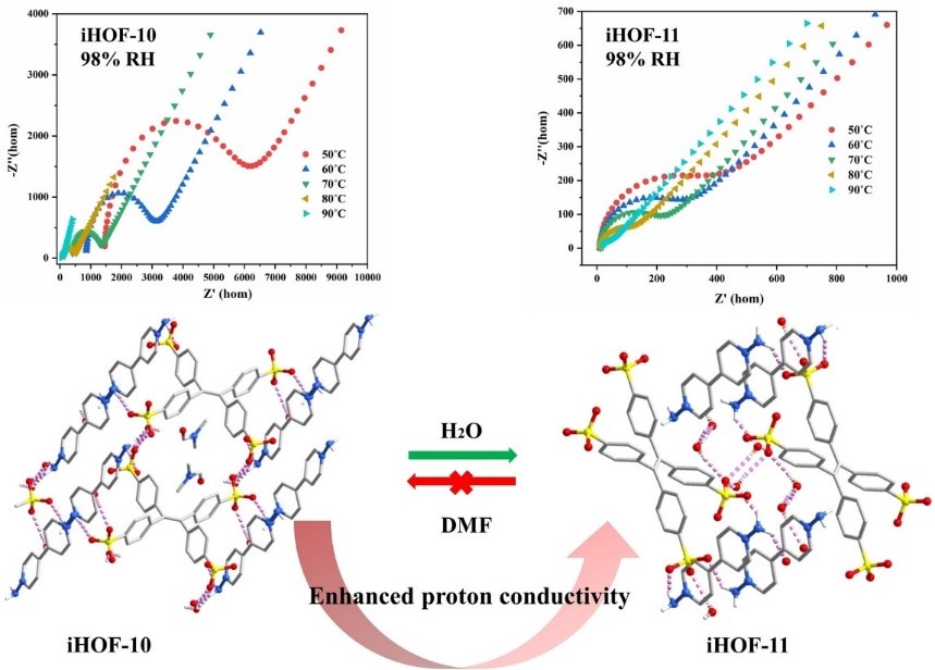本工作利用以四(4-磺酸基苯基)乙烯和1,1’-二氨基-4,4’-二聯(lián)吡啶進(jìn)行自組裝,既可以使用不同的溶劑合成了iHOF-10和iHOF-11,又可以將iHOF-10浸泡到水中后轉(zhuǎn)變?yōu)閕HOF-11。當(dāng)測(cè)試兩種材料在不同溫濕度條件下的質(zhì)子導(dǎo)電性能時(shí),發(fā)現(xiàn)在低溫低濕條件下iHOF-11的質(zhì)子傳導(dǎo)性能明顯優(yōu)于iHOF-10材料。隨著溫濕度的增加,iHOF-10的質(zhì)子導(dǎo)電率逐漸接近iHOF-11,這是由于溫濕度的增加,水分子進(jìn)去晶體內(nèi)并誘導(dǎo)iHOF-10發(fā)生單晶到單晶轉(zhuǎn)變?yōu)閕HOF-11。水分子進(jìn)入到iHOF-10中,取代了晶體內(nèi)的客體DMF分子并且參與到晶體氫鍵結(jié)構(gòu)的形成,提高了結(jié)構(gòu)的穩(wěn)定性并且提高質(zhì)子傳輸性能。利用HOFs材料的刺激響應(yīng)性,通過(guò)單晶到單晶的轉(zhuǎn)變的策略以優(yōu)化材料的質(zhì)子傳輸性能。