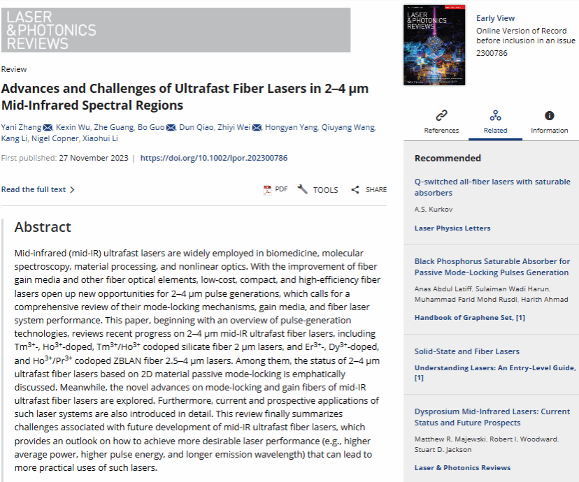 11月27日,我校物理與信息科學學院物理學科張亞妮教授聯(lián)合美國佐治亞理工大學廣哲博士、英國卡迪夫大學喬敦博士撰寫的題目為 “Advances and Challenges of Ultrafast Fiber Lasers in 2~4 μm Mid-Infrared Spectral Regions” 的論文在國際高水平期刊《Laser Photonics Reviews》發(fā)表。張亞妮教授為論文第一作者和通訊作者,我校物理學2023屆碩士武柯欣為共同第一作者,陜西科技大學為唯一通訊單位,哈爾濱工程大學郭波教授和中國科學院物理研究所魏志義研究員為共同通訊作者。