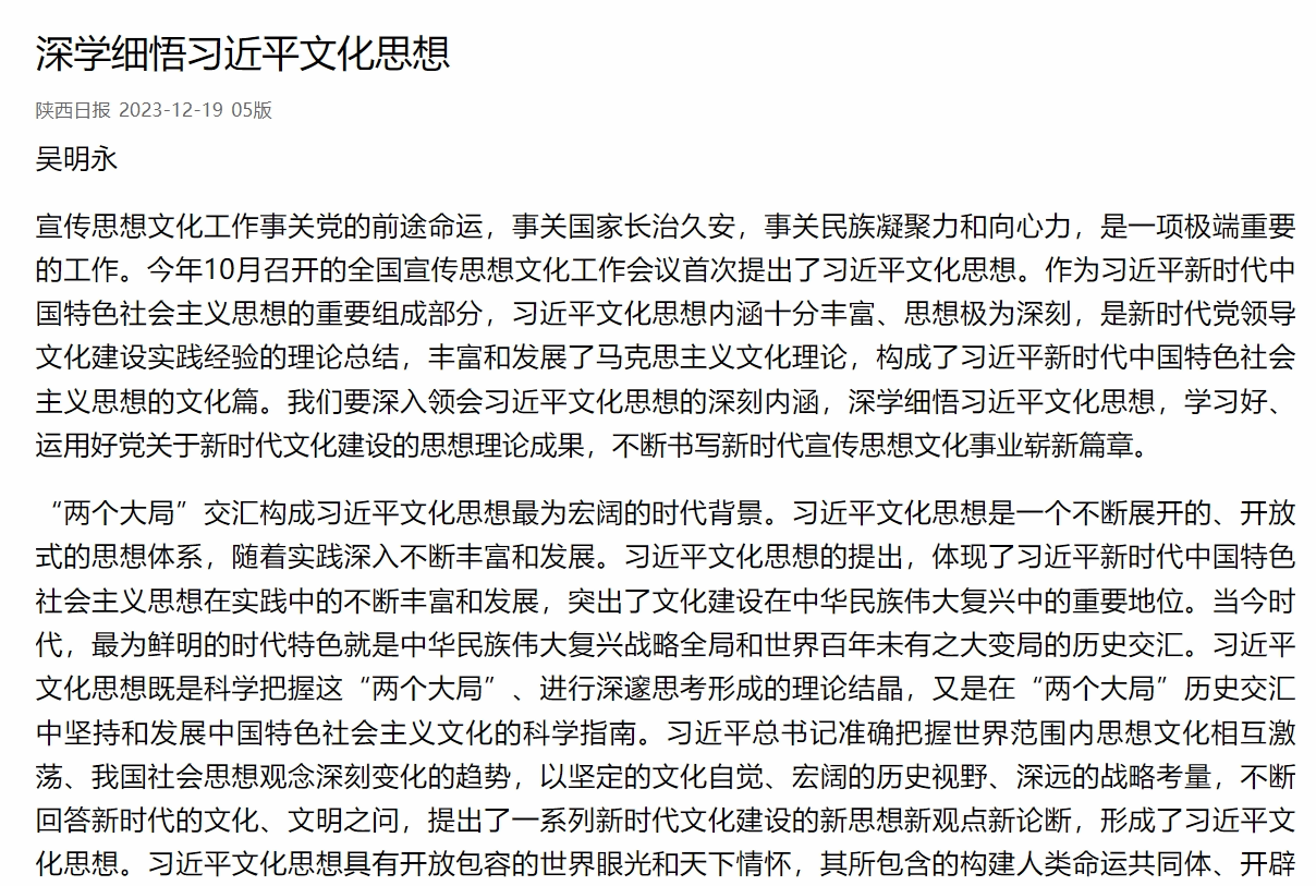 近日,《陜西日報》刊發(fā)我校馬克思主義學(xué)院院長吳明永教授理論文章《深學(xué)細悟習(xí)近平文化思想》。