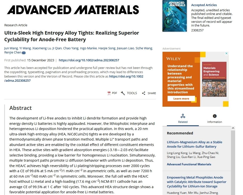 [1] Ultra-Sleek High Entropy Alloy Tights: Realizing Superior Cyclability for Anode-Free Battery, Advanced Materials, 2023, 2308257.