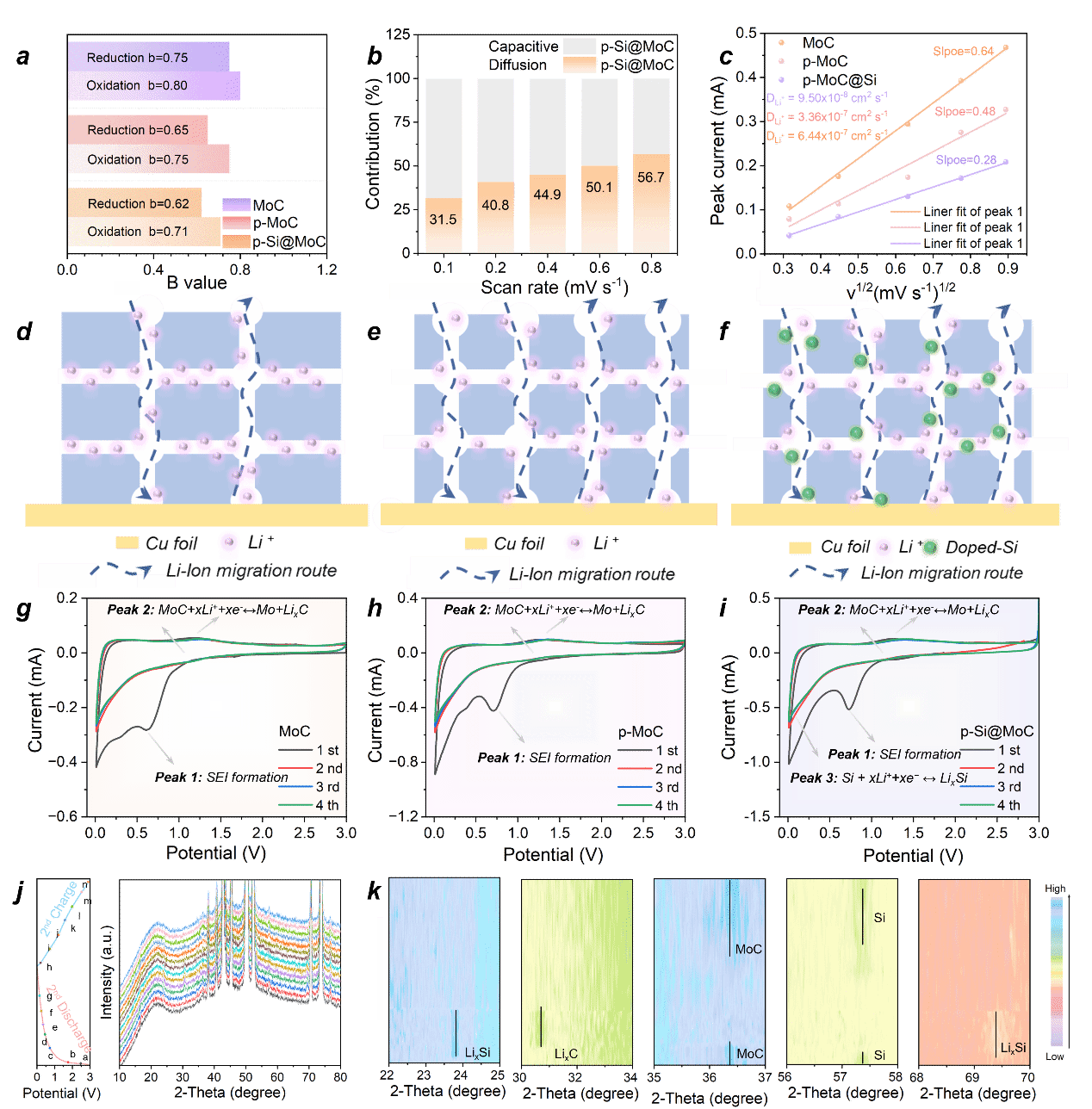 要點二:超低含量摻雜有效地誘導(dǎo)Si在p-Si@MoC中最大容量利用率