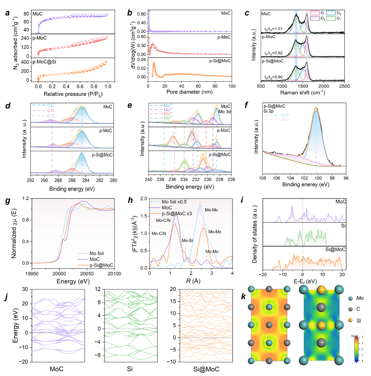 通過X射線近邊吸收光譜(XANES)和擴(kuò)展X射線吸收精細(xì)結(jié)構(gòu)譜(EXAFS),驗證了Si摻雜在MoC基體中形成的Mo-Si鍵。通過密度泛函理論(DFT)的計算,揭示了多孔Si@MoC優(yōu)異的電導(dǎo)率和電子傳遞能力。