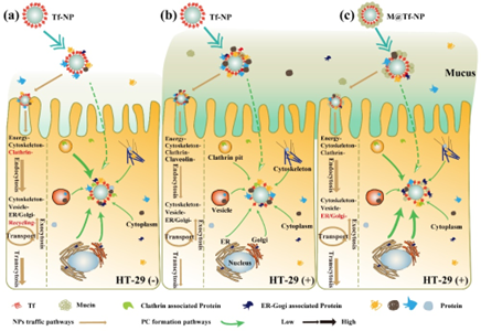 研究發(fā)現(xiàn),胃腸黏液層會(huì)削弱轉(zhuǎn)鐵蛋白修飾的主動(dòng)靶向納米載體(Tf-NP)在腸細(xì)胞的攝取及跨膜轉(zhuǎn)運(yùn)效率。在黏液分泌細(xì)胞中,Tf-NP表面形成的PCs掩蓋、抑制了Tf-NP的靶向作用。在無黏液細(xì)胞中,Tf-NP主要吸附大量與細(xì)胞骨架、囊泡等轉(zhuǎn)運(yùn)相關(guān)以及Tf特異性相關(guān)的蛋白,這些蛋白使納米載體的轉(zhuǎn)運(yùn)功能增強(qiáng),吸收效率提升?;诖?,團(tuán)隊(duì)利用黏液層中主要成分粘蛋白(mucin)預(yù)先包被Tf-NP形成“主動(dòng)PCs”以克服“被動(dòng)PCs”造成的困境,發(fā)現(xiàn)粘蛋白預(yù)包被納米載體(M@Tf-NP)顯著提高了Tf-NP的攝取及跨膜轉(zhuǎn)運(yùn)效率。這是因?yàn)椤爸鲃?dòng)PCs”的存在削弱了“被動(dòng)PCs”的形成能力;此外,基于mucin的糖蛋白及頂側(cè)分布特性,M@Tf-NP吸附了大量與內(nèi)質(zhì)網(wǎng)-高爾基體相關(guān)的轉(zhuǎn)運(yùn)蛋白,胞吐作用增強(qiáng)。由此可知,胃腸黏液通過“被動(dòng)PCs”的形成阻滯了主動(dòng)靶向納米載體的吸收,但也可基于“主動(dòng)PCs”策略來提高遞送效率。該研究詮釋了“以子之矛-攻子之盾”的科學(xué)現(xiàn)象,相關(guān)結(jié)果將為食品功能因子高效遞送體系構(gòu)建提供理論基礎(chǔ)和技術(shù)啟示。