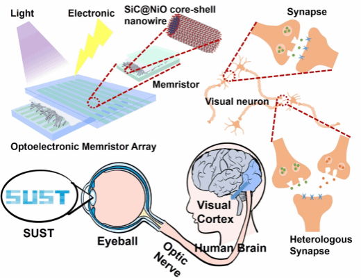 憶阻器是一種新型的電子元件,其作用類同于大腦中信息處理基本單元的神經(jīng)突觸功能,用其構(gòu)建的芯片具有類腦學(xué)習(xí)和低功耗的特點,是未來神經(jīng)形態(tài)器件和人工智能器件重要發(fā)展方向。近日,我校物理與信息科學(xué)學(xué)院材料原子分子科學(xué)研究所許并社領(lǐng)導(dǎo)的認知材料團隊尉國棟教授在著名國際學(xué)術(shù)期刊《Small》上發(fā)表題為“SiC@NiO Core-Shell Nanowire Networks-Based Optoelectronic Synapses for Neuromorphic Computing and Visual Systems at High Tempersture”的高水平論文。我校碩士研究生申偉康為第一作者,物理學(xué)院王盼老師為共同第一作者,尉國棟教授和李國強教授為共同通訊作者,陜西科技大學(xué)為第一通訊單位,華南理工大學(xué)為共同通訊單位,該論文的發(fā)表標(biāo)志著我校在基于第三代半導(dǎo)體碳化硅基光電突觸器件在神經(jīng)形態(tài)計算和人工視覺系統(tǒng)方面的突破。