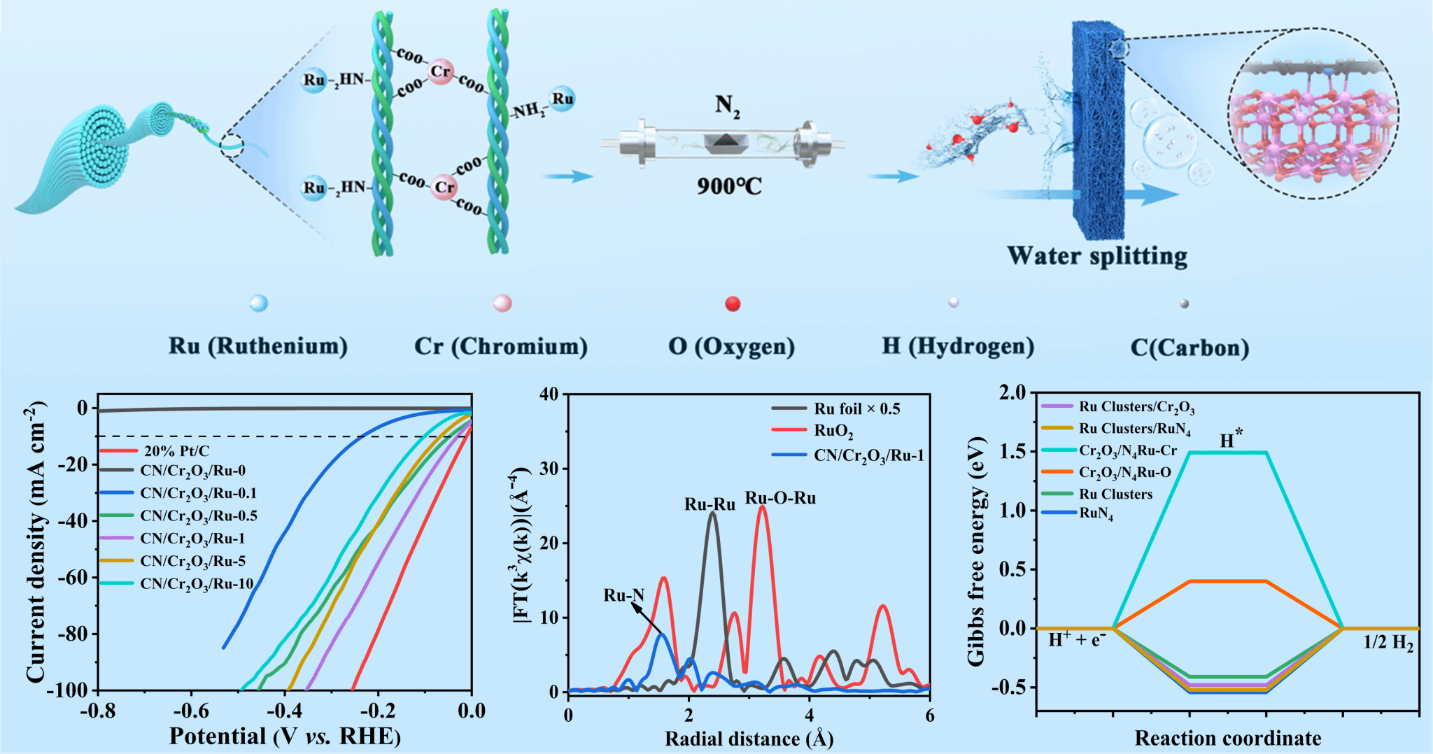 韓慶鑫副教授為生物質(zhì)與功能材料研究所(王學(xué)川教授科研團(tuán)隊(duì))成員,長(zhǎng)期從事生物質(zhì)資源化利用及功能材料的研究。固體廢棄物的處理也是構(gòu)建廢棄物循環(huán)利用體系是實(shí)施全面節(jié)約戰(zhàn)略、保障國(guó)家資源安全、積極穩(wěn)妥推進(jìn)碳達(dá)峰碳中和、加快發(fā)展方式綠色轉(zhuǎn)型的重要舉措。制革廢棄物高價(jià)值回收已成為皮革行業(yè)的關(guān)鍵關(guān)注點(diǎn),尤其是處理鞣革后產(chǎn)生的鉻革屑,是迫切需要解決的問題。如果能利用含鉻革屑制備含鉻電催化劑,將其中的鉻轉(zhuǎn)化為具有高附加值的產(chǎn)物,既可消除皮革廢棄物對(duì)環(huán)境的污染又符合循環(huán)經(jīng)濟(jì)和可持續(xù)發(fā)展的要求?;诖耍n慶鑫等人利用鉻革屑膠原纖維表面官能團(tuán)在熱解過程中固定Ru原子,成功制備了一種具有廣泛pH適用范圍的析氫反應(yīng)(HER)電催化劑。由于含鉻革屑表面存在大量的氨基,釕離子(Ru3+)可以通過形成CL-NH2-Ru絡(luò)合物吸附在含鉻革屑的表面,這使其在高溫煅燒的過程會(huì)盡可能避免形成Ru納米顆粒,而且含鉻革屑當(dāng)中的鉻元素也可以起到提升HER性能的作用。優(yōu)化后的樣品CN/Cr2O3/Ru-1表現(xiàn)出優(yōu)異的電催化性能,在1.0 M KOH中,電流密度為10 mA cm -2時(shí)的過電位僅為-28 mV,在酸性和中性電解液中也表現(xiàn)出良好的電催化性能,超過了已報(bào)道的大多數(shù)以Ru為催化中心的催化劑。密度泛函理論(DFT)計(jì)算表明,Cr2O3中的氧(O)和鉻(Cr)能與釕(Ru)原子的配位模式發(fā)生有利的相互作用,從而闡明了CN/Cr2O3/Ru中Cr對(duì)催化中心Ru的協(xié)同增強(qiáng)作用。該研究工作既為含鉻制革廢棄物提供了綠色處理方案,又為開發(fā)高性能、低成本電催化劑開辟了新途徑,展現(xiàn)了環(huán)保與新能源材料研發(fā)的雙重潛力。上述工作以“Atomic-scale Ru anchored on chromium-shavings as a precursor for a pH-universal hydrogen evolution reaction electrocatalyst”為題已在線發(fā)表,全文鏈接:https://pubs.rsc.org/en/content/articlelanding/2024/mh/d3mh01951a 。該工作得到了國(guó)家自然科學(xué)基金項(xiàng)目(21908140),陜西省教育廳科學(xué)研究計(jì)劃(22JP006),輕化工助劑化學(xué)與技術(shù)教育部重點(diǎn)實(shí)驗(yàn)室和陜西省輕化工助劑化學(xué)與技術(shù)協(xié)同創(chuàng)新中心開放基金(KFKT2021-15)的資助。