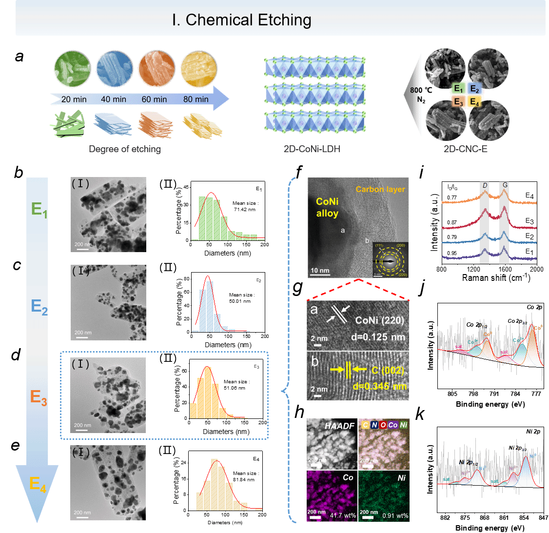 1.設(shè)計(jì)了“兩步氧化還原”策略,利用咪唑酸鈷硼骨架(Co-BIF)為前驅(qū)體,通過(guò)改變2D-CNC-Ex(x=1、2、3和4分別表示20、40、60和80 min)的化學(xué)氧化刻蝕時(shí)間,實(shí)現(xiàn)了阻抗特性的定制調(diào)控。進(jìn)一步,調(diào)節(jié)2D-CNC-Tx的(x=1、2和3分別表示600、800和1000℃)煅燒還原溫度,通過(guò)原位顯微技術(shù)深入揭示材料內(nèi)部隨溫度變化的二維復(fù)合材料的結(jié)構(gòu)演變。