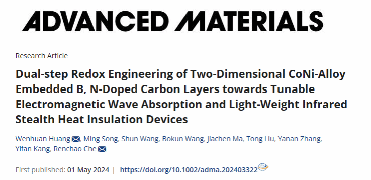 針對(duì)上述問(wèn)題,近日,陜西科技大學(xué)化學(xué)與化工學(xué)院黃文歡教授團(tuán)隊(duì)與復(fù)旦大學(xué)車(chē)仁超教授合作報(bào)道了一個(gè)兩步氧化還原法構(gòu)造高性能二維電磁波吸收材料及多功能器件的組裝方法,并通過(guò)原位顯微技術(shù)揭示了材料的結(jié)構(gòu)演化機(jī)制與電磁耦合協(xié)同機(jī)制。相關(guān)工作在《Advanced Materials》期刊上以“Dual-step Redox engineering of two-dimensional CoNi-alloy embedded B, N-doped carbon layers towards tunable electromagnetic wave absorption and light-weight infrared stealth heat insulation devices”為題發(fā)表。陜西科技大學(xué)為第一通訊單位,通訊作者為陜西科技大學(xué)黃文歡教授和復(fù)旦大學(xué)車(chē)仁超教授。