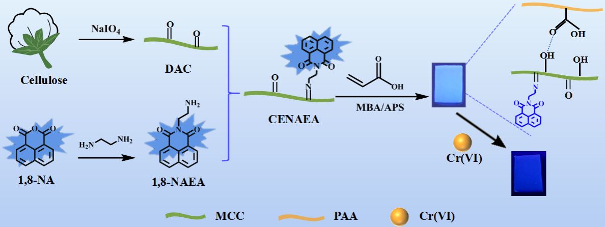 本論文的創(chuàng)新之處在于開發(fā)了一種基于1,8-萘酰亞胺改性纖維素的復(fù)合熒光水凝膠(CENAEA/PAA),這種材料不僅能高效且選擇性地檢測(cè)和吸附Cr(VI),而且具有0.58 μmol/L的低檢測(cè)限和189.04 mg/g的高吸附容量。其熒光猝滅行為與偽二級(jí)模型和Freundlich模型的良好擬合,其在重金屬離子檢測(cè)與環(huán)境修復(fù)中具有很好的應(yīng)用前景。