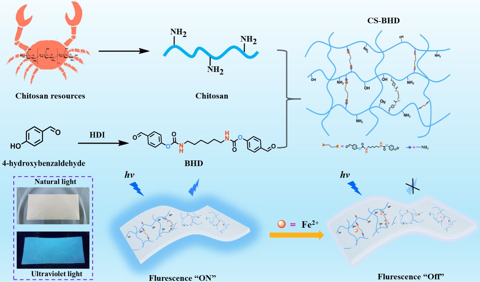 本論文的創(chuàng)新之處在于制備了一種以殼聚糖為基材、以雙苯甲醛(BHD)為交聯(lián)劑的熒光殼聚糖基水凝膠薄膜(CSBHD),該薄膜具有靈敏檢測(cè)Fe2+和高效吸附Fe2+離子的性能。CSBHD薄膜能夠在0-160 -1范圍內(nèi)對(duì)Fe2+離子顯示出線性熒光強(qiáng)度響應(yīng),極低檢測(cè)限為0.55 μ.,最大吸附容量為223.5 g/mg。該材料為環(huán)境監(jiān)控和Fe2+等重金屬離子吸附提供了新方法。