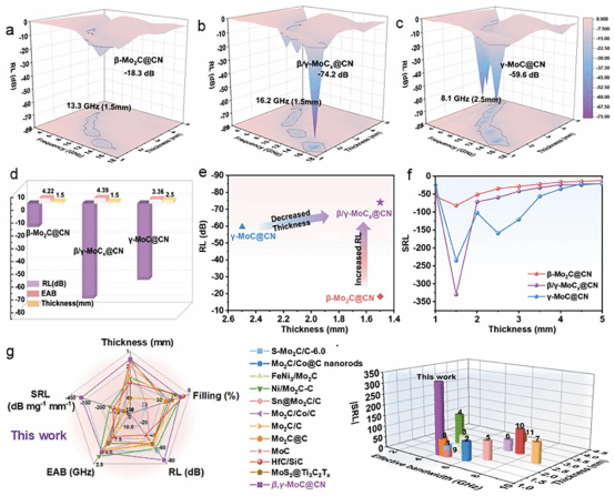 圖2. β/γ-MoCx@CN的優(yōu)異電磁波吸收性能