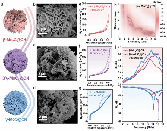 3. β/γ-MoCx@C復(fù)合材料具有大量特定表面積,通過增大表面積有效消耗入射電磁波,促進(jìn)多重散射效應(yīng),并增強(qiáng)入射EMW的反射。此外,這些混合納米結(jié)構(gòu)提供了豐富的電子活性位點和高載流子濃度,最終改善了微波能量的衰減,為電磁波吸收材料開發(fā)設(shè)計提供了一個很好的范例。