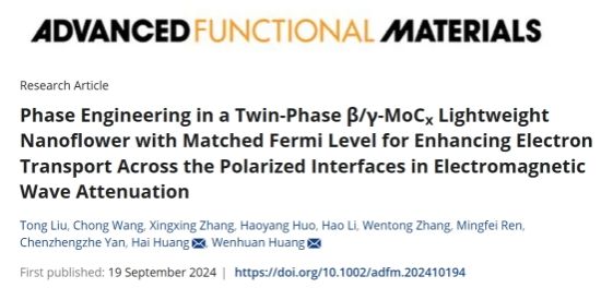 針對上述問題,近日,陜西科技大學(xué)化學(xué)與化工學(xué)院黃文歡教授團(tuán)隊與西安石油大學(xué)黃海教授合作,在輕質(zhì)MoCx納米花中構(gòu)建了具有匹配費米能級和閉合功函數(shù)特性的β/γ-MoCx@CN雙相結(jié)構(gòu),研究電導(dǎo)/極化損耗的內(nèi)部機(jī)制并闡明其在介電常數(shù)衰減中的貢獻(xiàn)。相關(guān)工作在《Advanced Functional Materials》期刊上以“Phase Engineering in a Twin-Phase β/γ-MoCx Lightweight Nanoflower with Matched Fermi Level for Enhancing Electron Transport Across the Polarized Interfaces in Electromagnetic Wave Attenuation”為題發(fā)表。