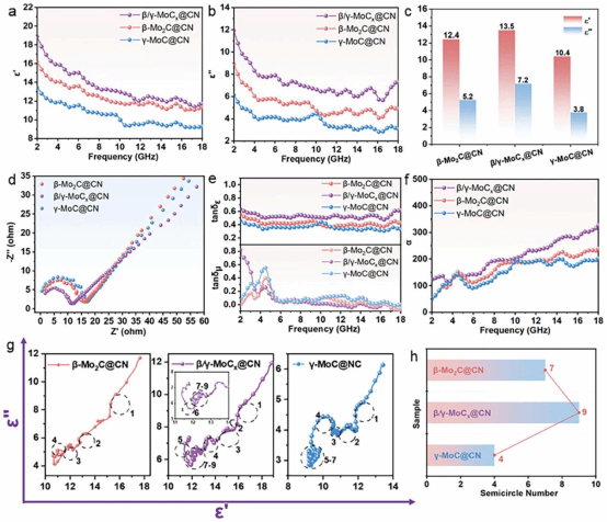 圖3. 雙相β/γ-MoCx@CN的電磁參數(shù)、阻抗特性及介電性能