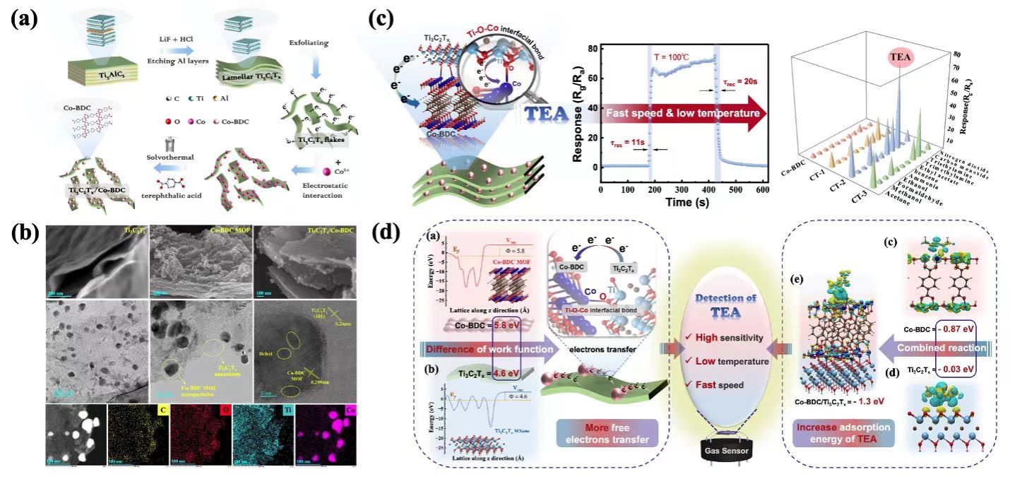 針對以上技術問題,我校陳慶彩教授團隊開發(fā)出一種基于MXene復合材料的新型氣體傳感器,實現(xiàn)了對有機胺氣體的超靈敏檢測。并且該傳感器工作穩(wěn)定能夠在低于100攝氏度條件下,顯著提高了傳感器在易燃易爆環(huán)境中的安全性與適用性。該傳感器采用類金屬MXene作為修飾材料,將響應時間和恢復時間平均縮短至15秒,達到了亞分鐘級的快速檢測。通過理論模擬發(fā)現(xiàn),這一技術傳感器性能的提升機制在于MXene和MOFs之間Ti-O-Co界面鍵的形成,該界面鍵不僅提高了傳感器材料的載流子遷移率,還增強了對有機胺分子的吸附能,有效提升了傳感器的綜合檢測性能。該傳感器可以為易燃易爆區(qū)域的空氣質量監(jiān)測提供了安全、高效、便攜、低成本的解決方案,保障工業(yè)安全生產和社會人類健康。目前,該項技術也已經獲得了國家發(fā)明專利授權。