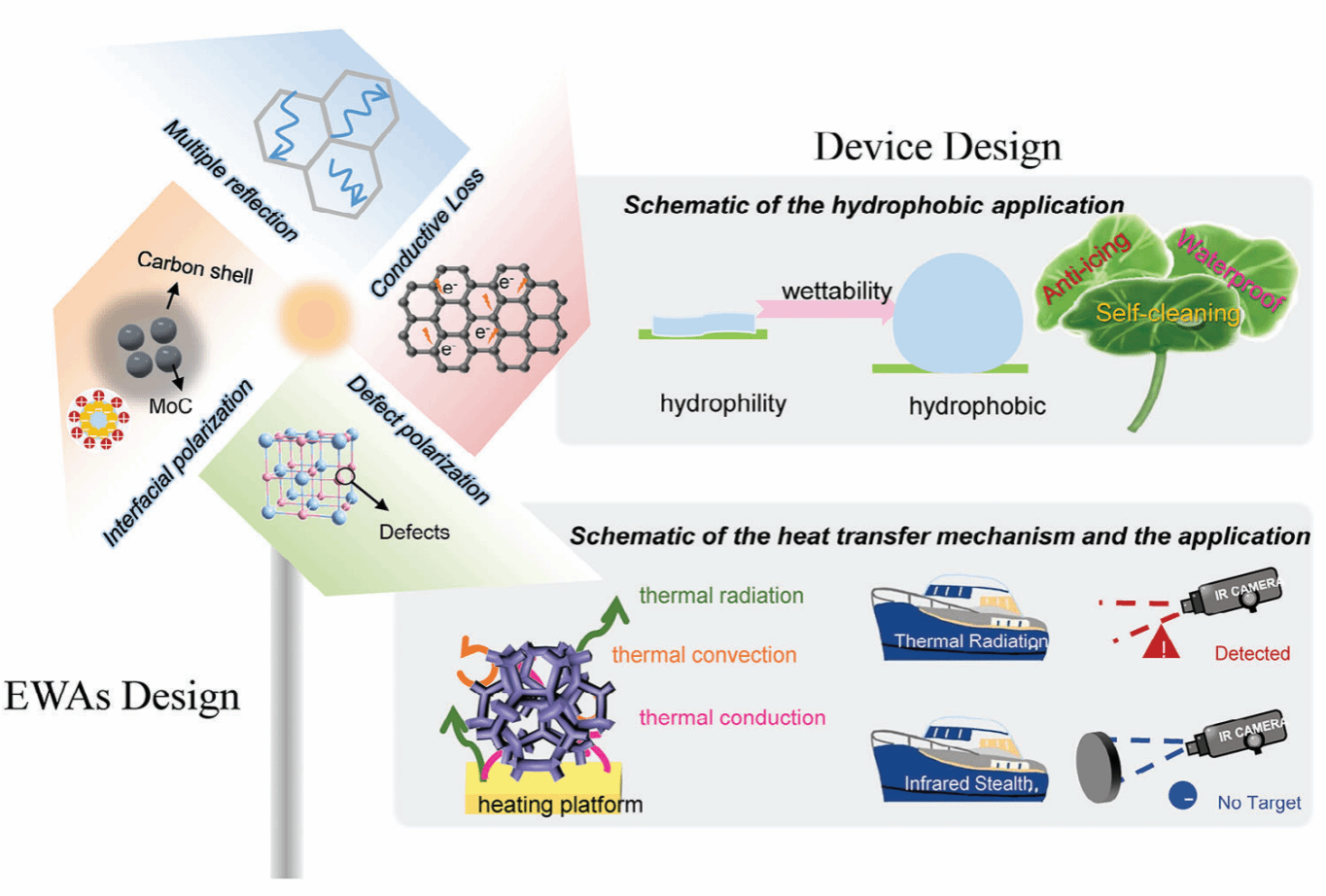 電磁波吸收機(jī)制示意圖、疏水應(yīng)用示意圖及傳熱機(jī)制與應(yīng)用示意圖