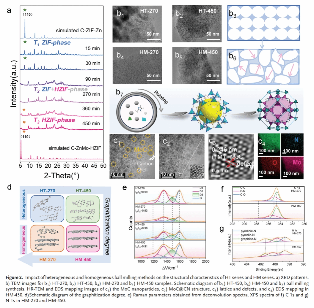 為了解決上述問(wèn)題,陜西科技大學(xué)黃文歡教授團(tuán)隊(duì)開(kāi)發(fā)出了一種簡(jiǎn)便且可擴(kuò)展實(shí)施的策略,即利用ZnMo-HZIF材料,通過(guò)球磨發(fā)泡和高溫煅燒工藝,成功構(gòu)建出多氮摻雜的MoC/NC三維泡沫結(jié)構(gòu)復(fù)合材料。這項(xiàng)工作提出了關(guān)于結(jié)構(gòu)和組分對(duì)電磁波吸收性能協(xié)同效應(yīng)的新視角,并為制備輕質(zhì)高性能MOF基電磁波吸收材料提供了新方法。相關(guān)工作在《Advanced Functional Materials》期刊上以“In situ Mechanical Foaming of Hierarchical Porous MoC for Assembling Ultra-light, Self-cleaning, Heat-insulation, Flame-retardant, and Infrared-stealth Device”為題發(fā)表。
