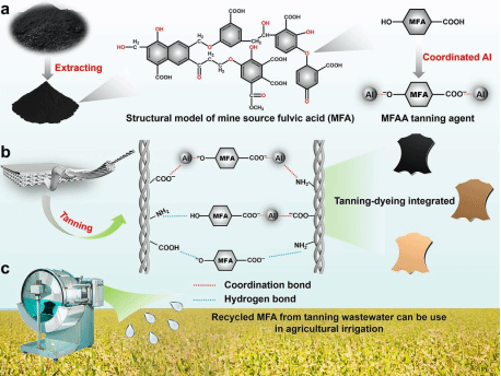 7. 團(tuán)隊(duì)強(qiáng)濤濤教授成功開發(fā)了一種生態(tài)復(fù)鞣劑,該劑利用皮革固體廢料,將含鉻皮革屑水解為低分子量的明膠多肽,并與金屬離子(如Zr4+和Al3+)形成復(fù)鞣劑。該復(fù)鞣劑能夠與膠原纖維形成多點(diǎn)交聯(lián),從而顯著提升復(fù)鞣皮革的機(jī)械性能,并有效去除游離甲醛。此外,金屬離子的參與還增強(qiáng)了皮革對(duì)染料和加脂劑的吸收能力,減少了醛鞣皮革的潛在危害與廢水排放,對(duì)清潔后鞣制過(guò)程具有重要意義。強(qiáng)濤濤教授還研發(fā)了一種可按需調(diào)節(jié)和廢水回收的黃腐酸基無(wú)鉻鞣劑,成功實(shí)現(xiàn)了鞣染一體化的創(chuàng)新策略。該新型無(wú)鉻鞣劑(MFAA)是基于風(fēng)化煤提取的腐殖酸與鋁離子的結(jié)合,能夠與皮革膠原纖維形成穩(wěn)定的交聯(lián)效果,并具備原位染色能力。同時(shí),該方法還能夠提取鞣制廢水中的殘留鋁,回收的腐殖酸可作為水稻種子的發(fā)芽劑。這一新型鞣染一體化方法為皮革行業(yè)的可持續(xù)發(fā)展提供了新的解決方案,標(biāo)志著無(wú)鉻鞣劑研究的又一重要里程碑。相關(guān)成果已發(fā)表在Chemical Engineering Journal, 2024, 482, 148892;International Journal of Biological Macromolecules, 2024, 261, 129922。