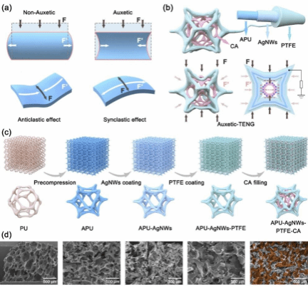 1. 制備基于負(fù)泊松比超材料的摩擦納米發(fā)電機(jī)(Auxetic-TENG),相比常用正泊松比材料可更高效吸收并轉(zhuǎn)化機(jī)械能為電能,具有更優(yōu)異的發(fā)電效率和檢測(cè)靈敏度。經(jīng)過(guò)測(cè)試,Auxtic -TENG的開路電壓與傳統(tǒng)的接觸分離TENG相比提高了4倍,功率密度達(dá)到4.2 W m?2。應(yīng)用實(shí)驗(yàn)表明在各種壓縮比和應(yīng)力條件下,Auxetic-TENG可以保持優(yōu)越的靈敏性和耐用性,突出其作為可穿戴自供電傳感器用于綜合醫(yī)療保健的潛力。相關(guān)成果發(fā)表在Advanced Energy Materials(DOI: https://doi.org/10.1002/aenm.202400212)上。通訊作者為陜西科技大學(xué)輕工科學(xué)與工程學(xué)院王學(xué)川教授和劉新華副教授, 岳歐陽(yáng)為本論文的第一作者。