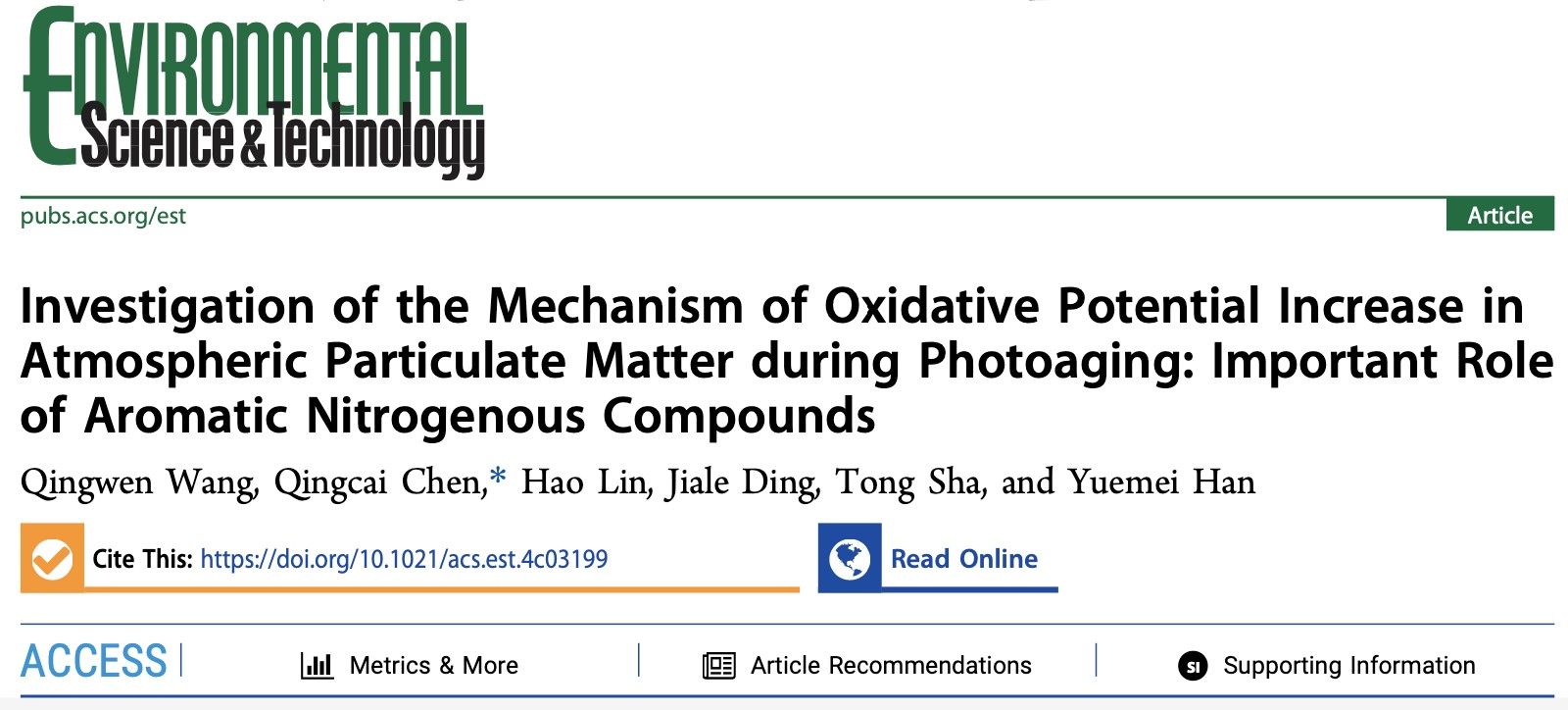 近日,環(huán)境學(xué)院陳慶彩教授團(tuán)隊(duì)關(guān)于大氣污染健康風(fēng)險(xiǎn)的研究成果,在大氣領(lǐng)域頂級期刊《Environmental Science & Technology》(中科院一區(qū)TOP,自然指數(shù)期刊)上發(fā)表,題目為“Investigation of the mechanism of oxidative potential increase in atmospheric particulate matter during photoaging: important role of aromatic nitrogenous compounds”。陳慶彩教授為唯一通訊作者,碩士研究生王擎雯為第一作者,陜西科技大學(xué)為第一單位和唯一通訊單位。