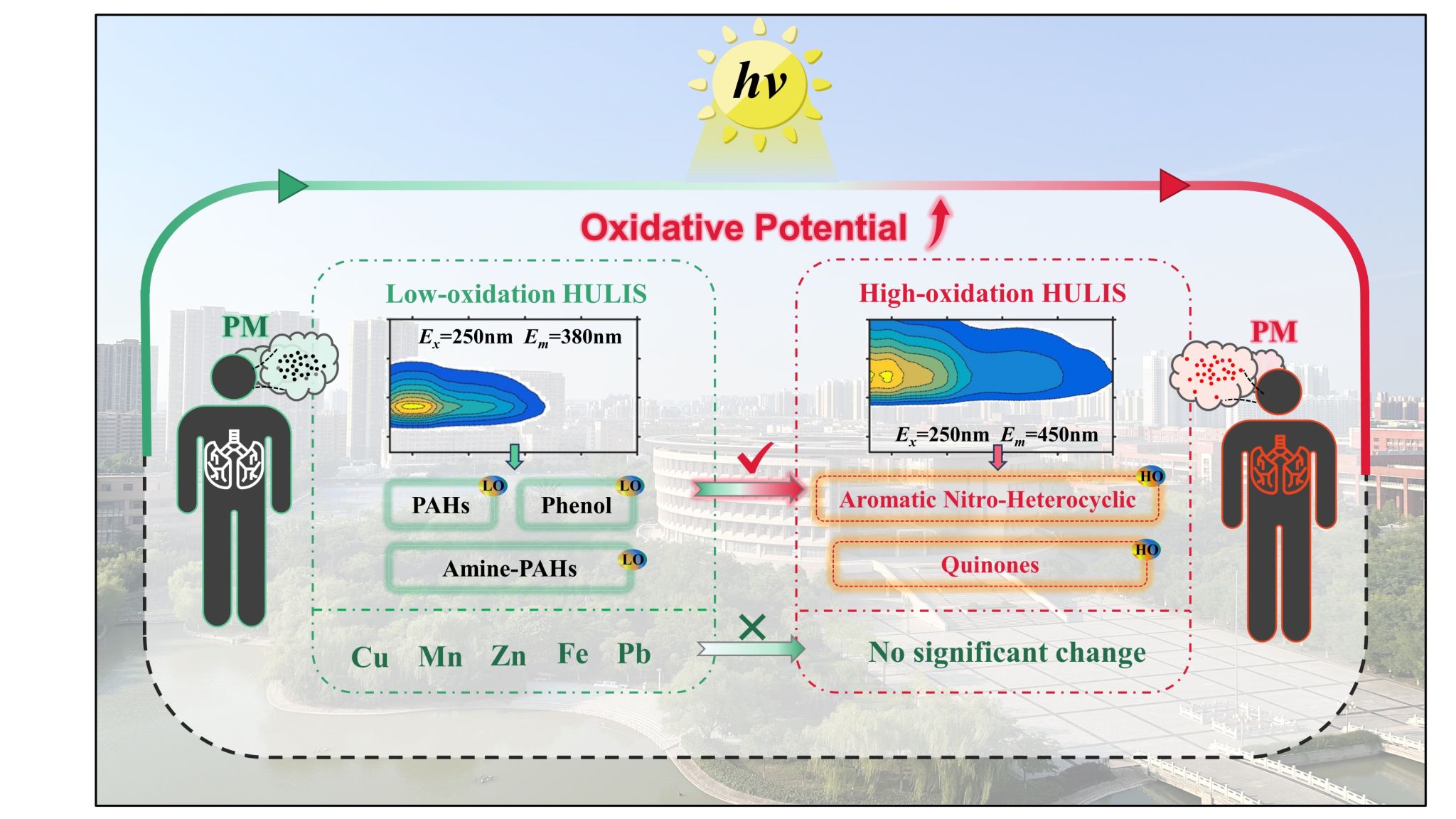 大氣顆粒物已成為全球五大死亡風(fēng)險(xiǎn)因素之一,直接威脅公共健康。然而,大氣顆粒物的毒性在復(fù)雜的環(huán)境過程中表現(xiàn)出動態(tài)變化特征,這種現(xiàn)象為準(zhǔn)確評估大氣污染健康風(fēng)險(xiǎn)帶來了巨大挑戰(zhàn)。為此,陳慶彩教授團(tuán)隊(duì)圍繞太陽光照對大氣顆粒物氧化毒性的影響特征和機(jī)制開展了深入研究,通過揭示大氣顆粒物毒性隨環(huán)境因素的動態(tài)變化特征和的化學(xué)機(jī)制,為改進(jìn)大氣污染源頭控制技術(shù)、優(yōu)化健康風(fēng)險(xiǎn)評估模型和制定精細(xì)化大氣污染防治策略提供了重要科學(xué)支撐。