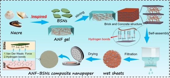 團(tuán)隊(duì)利用化學(xué)輔助機(jī)械法首次從玄武巖鱗片(BS)中制備了具有超高徑厚比(約780.1)的玄武巖納米片(BSNs)。隨后,通過(guò)真空輔助自組裝法將BSNs與芳綸納米纖維(ANF)組裝成仿貽貝結(jié)構(gòu)的ANF-BSNs復(fù)合納米紙。該復(fù)合紙?jiān)跇O低的BSNs含量下具有明顯的層狀結(jié)構(gòu),顯著提升了復(fù)合納米紙的機(jī)械性能和絕緣性能,使其在現(xiàn)代小型化高功率電氣設(shè)備中具有廣闊的應(yīng)用前景。研究成果以“Novel Fabrication of Basalt Nanosheets with Ultrahigh Aspect Ratios Toward Enhanced Mechanical and Dielectric Properties of Aramid Nanofiber-Based Composite Nanopapers”發(fā)表在《Advanced Science》上。博士研究生戢德賢為本研究的主要完成人,宋順喜副教授、張美云教授為通訊作者。
