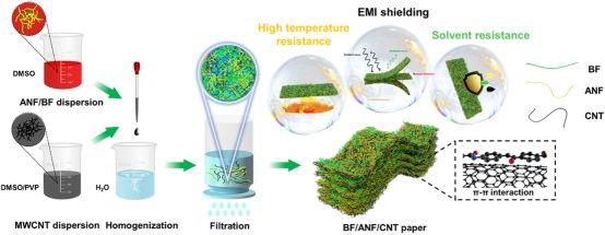 團(tuán)隊(duì)通過(guò)真空輔助過(guò)濾法制備了一種具有“鋼筋混凝土”層狀結(jié)構(gòu)的復(fù)合紙,利用了具有優(yōu)異溫度耐受性和高導(dǎo)電性的玄武巖纖維(BF)、芳綸納米纖維(ANFs)和多壁碳納米管(CNTs)。制備的BF/ANF/CNT復(fù)合紙具有優(yōu)異的熱穩(wěn)定性和化學(xué)穩(wěn)定性,在高低溫、酸堿腐蝕等極端環(huán)境下,仍保持良好的電磁屏蔽性能。此外,復(fù)合紙還展示了優(yōu)異的焦耳加熱性能,具有快速電熱響應(yīng)和良好的溫度可控性?;谄鋬?yōu)異的性能,BF/ANF/CNT復(fù)合紙?jiān)诤娇蘸教?、電子通信和智能穿戴設(shè)備的電磁干擾屏蔽和熱管理系統(tǒng)中具有巨大的應(yīng)用潛力。研究成果以“Flexible Basalt Fiber/Aramid Nanofiber/Carbon Nanotube Electromagnetic Shielding Paper with Outstanding Environmental Stability and Joule Heating Performance”發(fā)表在《ACS Applied Materials & Interfaces》上。碩士黎凌浩為本研究的主要完成人,宋順喜副教授為通訊作者。
