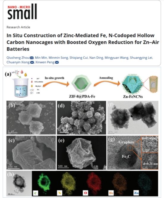 近日,本課題組周秋生副教授在設(shè)計高性能雙功能氧電催化劑并應(yīng)用于可充電鋅-空氣電池方面取得重要進(jìn)展,相關(guān)成果以“In Situ construction of zinc-mediated Fe, N-codoped hollow carbon nanocages with boosted oxygen reduction for Zn air batteries”為題發(fā)表在Small期刊(文章鏈接:https://doi.org/10.1002/smll.202307943)。本文通過熱解表面聚合鐵摻雜聚多巴胺ZIF-8多面體,合成了鋅誘導(dǎo)的Fe, N共摻雜碳納米籠(Zn-FeNCNs)。理論計算和實驗結(jié)果均表明,多面體與聚多巴胺之間的強(qiáng)相互作用促進(jìn)了高活性鋅調(diào)制的FeNx位點的演化和電子傳遞,從而提高了氧析反應(yīng)(OER)和氧還原反應(yīng)(ORR)的雙功能催化活性。此外,當(dāng)將該催化劑應(yīng)用于固態(tài)電池時,該器件在不同彎曲角度下表現(xiàn)出優(yōu)異的機(jī)械穩(wěn)定性和較高的往返效率。