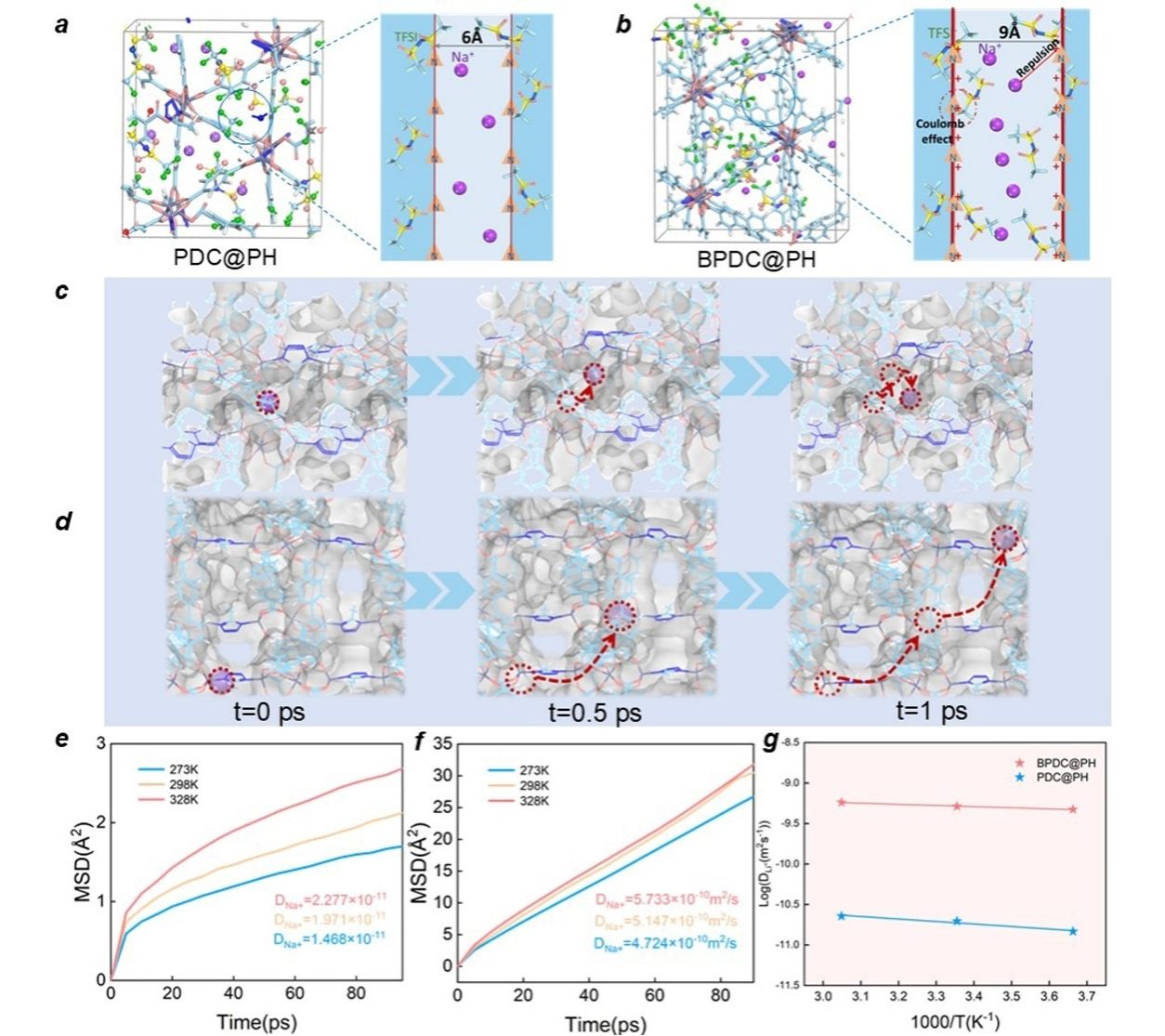 1. 精準設(shè)計MOF孔道,實現(xiàn)離子高效傳輸。通過調(diào)控配體長度形成孔徑分別為6 ?和9 ?的一維通道。其中,BPDC@PH電解質(zhì)憑借更大的孔道(9 ?)及孔壁靜電吸附特性,顯著優(yōu)化了鈉離子(Na?)擴散路徑,并選擇性吸附陰離子(TFSI?),使離子遷移數(shù)提升至0.87,電導率達7.74 × 10?? S cm?1(35°C)。