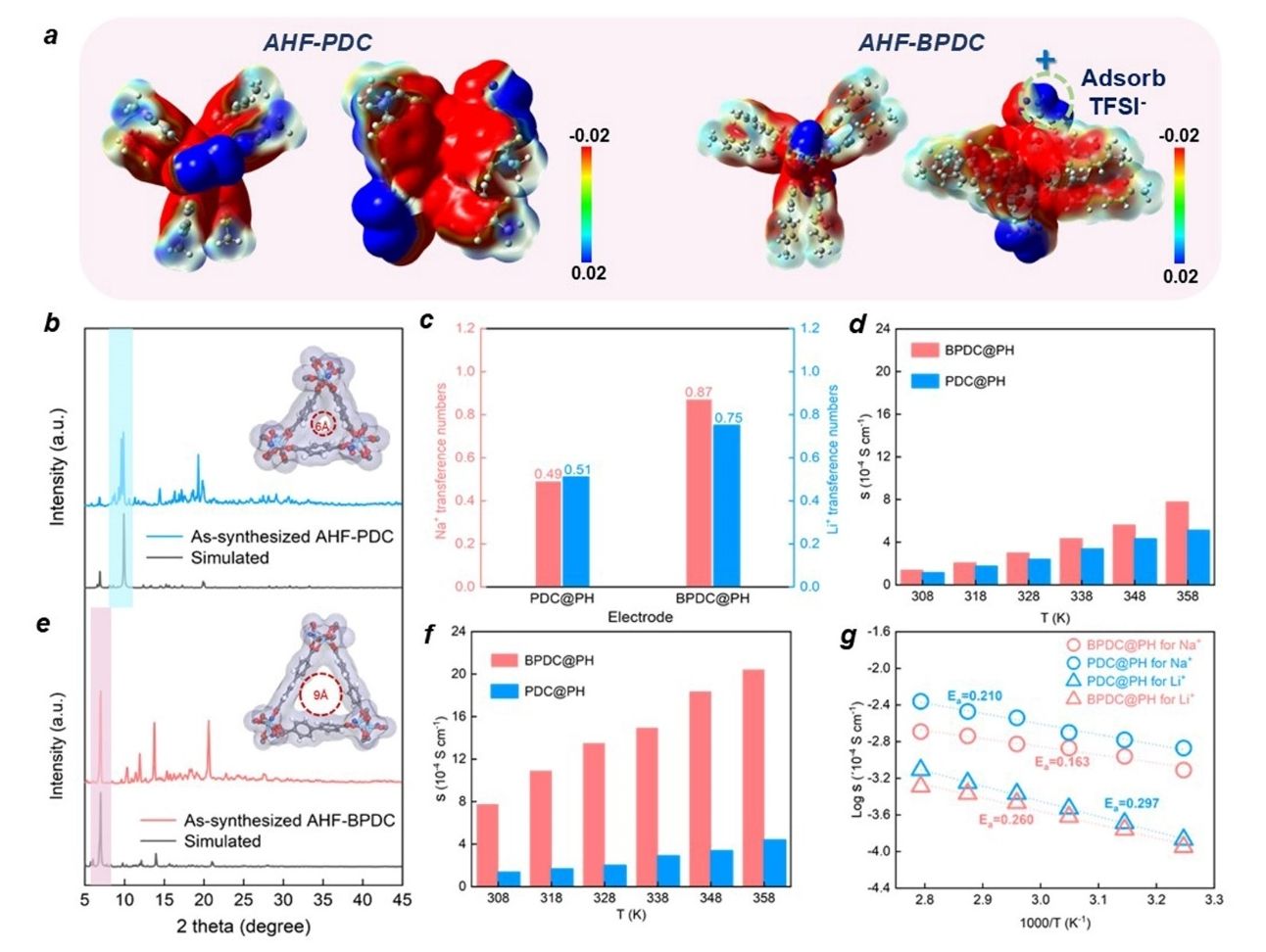 針對上述問題,近日,陜西科技大學化學與化工學院黃文歡教授團隊設(shè)計出兩種鋅基MOF材料(AHF-PDC與AHF-BPDC),通過調(diào)控配體長度形成孔徑分別為6 ?和9 ?的一維通道。其中,BPDC@PH電解質(zhì)憑借更大的孔道(9 ?)及孔壁靜電吸附特性,顯著優(yōu)化了鈉離子(Na?)的擴散路徑。同時,該材料能夠選擇性吸附陰離子(TFSI?),從而將離子遷移數(shù)提升至0.87,并在35°C下實現(xiàn)了7.74 × 10?? S cm?1的高電導率。這一研究為開發(fā)高性能鈉金屬電池電解質(zhì)提供了重要的理論依據(jù)和實驗支持。相關(guān)工作在《Advanced Functional Materials》期刊上以“Enhanced Ionic Diffusion via Refined Pillared 1D Channels for Sodium Metal Batteries”為題發(fā)表。