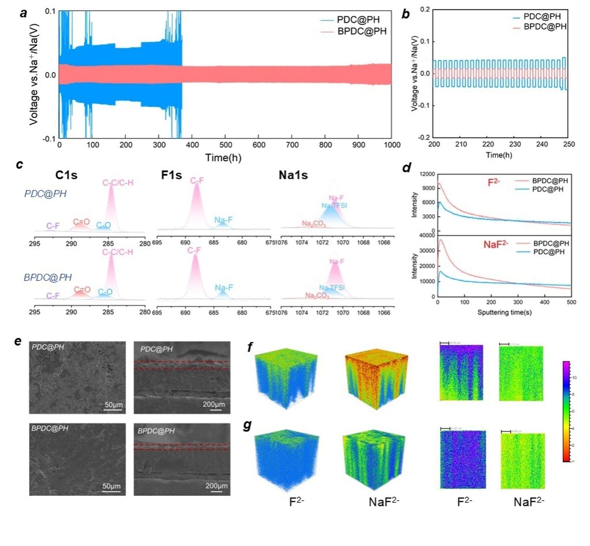 2. 超長循環(huán)穩(wěn)定性與界面優(yōu)化。在1.0 mA cm?2電流密度下,鈉金屬對稱電池連續(xù)運行超1000小時無短路,全電池(NVP|BPDC@PH|Na)循環(huán)1000次后容量保持率高達98%。分子動力學模擬顯示,擴大的MOF孔道加速了NaTFSI的傳輸,促進負極表面形成富含NaF的薄層固態(tài)電解質(zhì)界面(SEI),有效抑制枝晶生長。組裝的固態(tài)軟包電池在彎折、切割等極端條件下仍可穩(wěn)定供電,并點亮LED燈組,展現(xiàn)出優(yōu)異的機械安全性和商業(yè)化潛力。