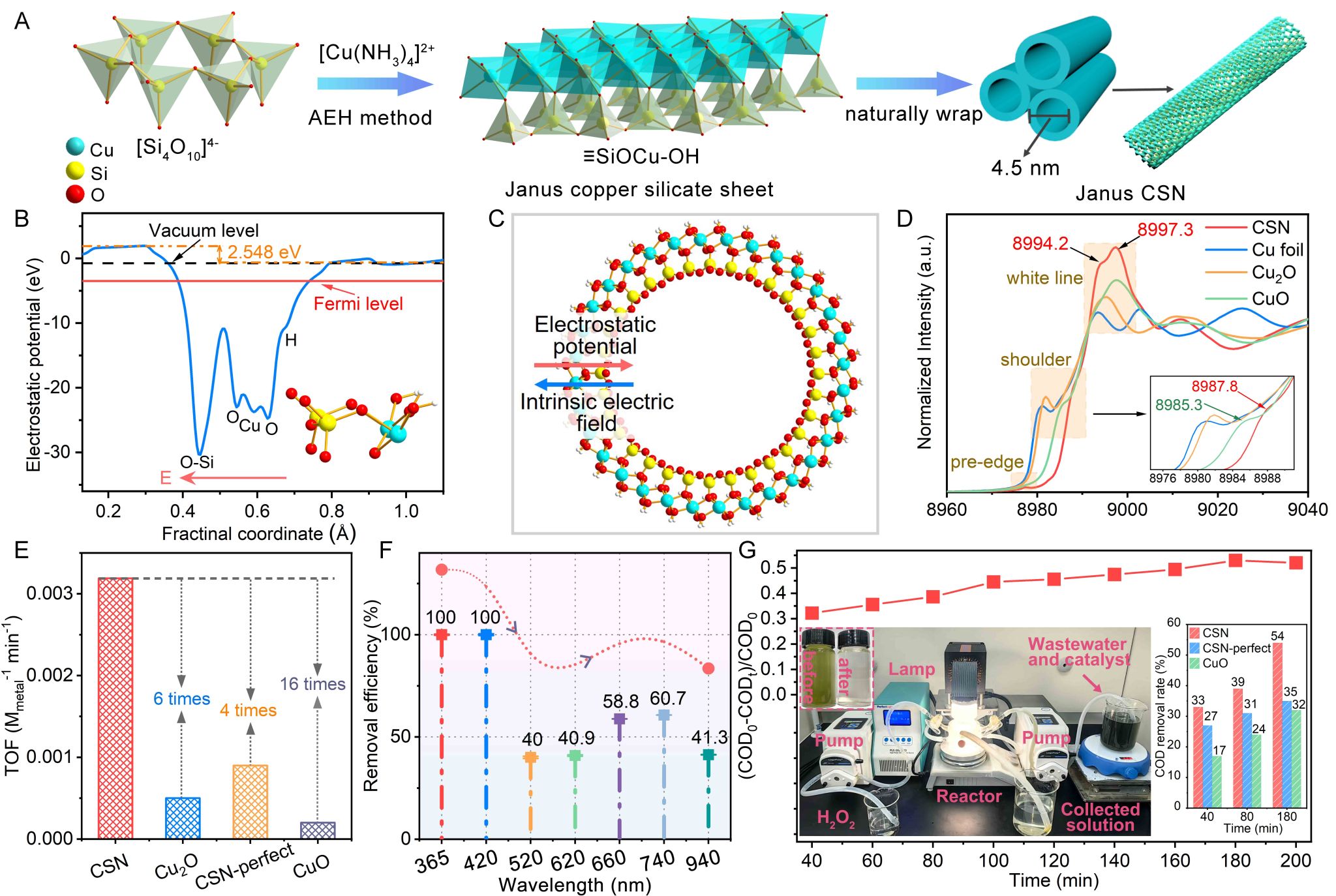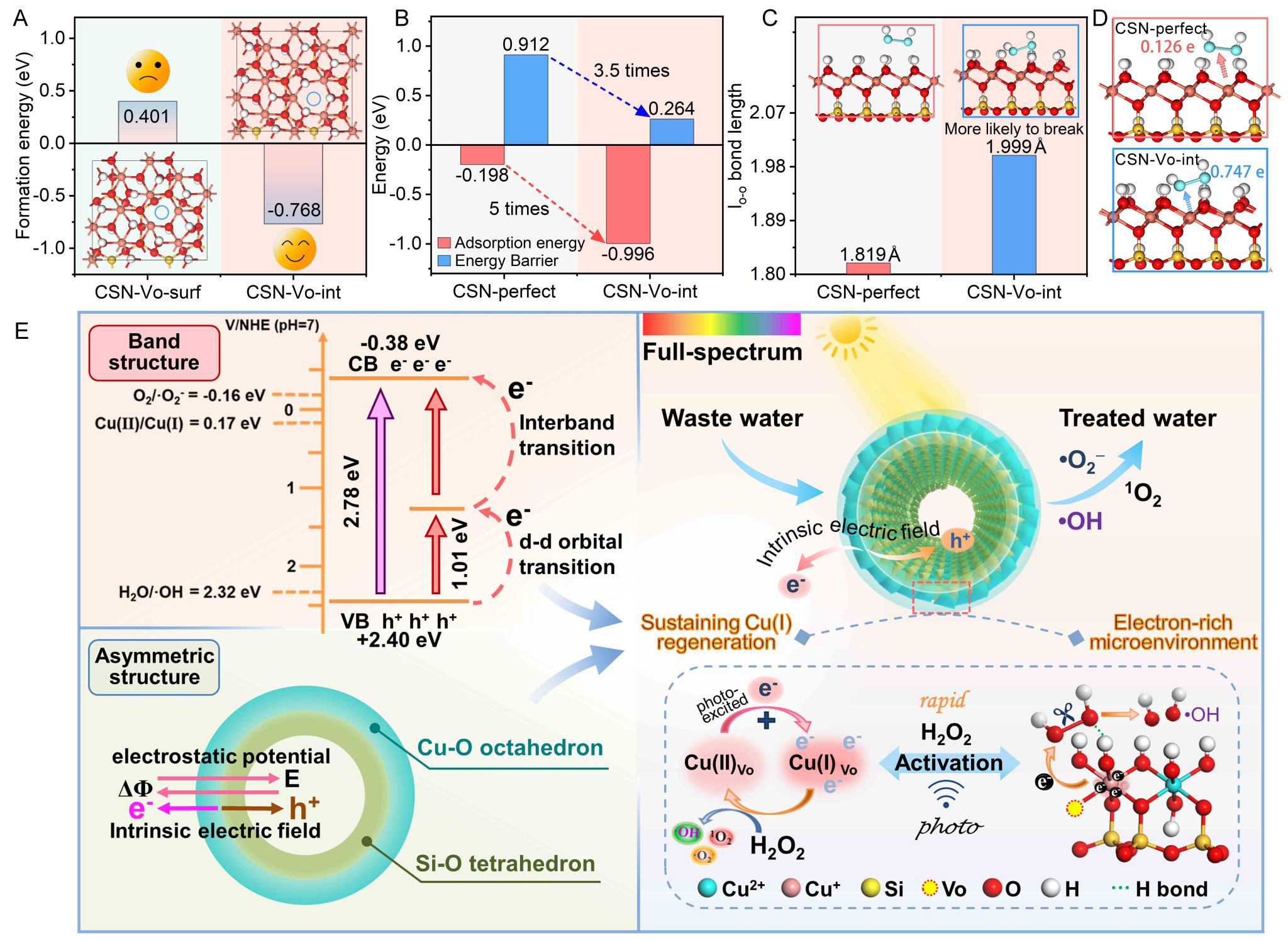 為了克服上述挑戰(zhàn),陜西科技大學(xué)王蘭教授團隊提出了一種非對稱結(jié)構(gòu)設(shè)計策略,構(gòu)建了Janus硅酸銅納米管(CSN)并誘導(dǎo)產(chǎn)生了富電子Cu(Ⅰ)和氧空位缺陷(Vo)位點,實現(xiàn)了有效的全光譜驅(qū)動光芬頓催化。該研究發(fā)現(xiàn),Vo和CuO6八面體結(jié)構(gòu)的共存使得CSN獲得了優(yōu)異的全光譜光響應(yīng)能力;不對稱結(jié)構(gòu)所產(chǎn)生的固有內(nèi)建電場極大地促進了光生載流子的空間分離和光生電子的定向轉(zhuǎn)移;Cu(Ⅰ)位點附近的Vo充當(dāng)電子陷阱位點,將光生電子富集到其鄰近的Cu位點,加速了Cu(Ⅱ)/Cu(Ⅰ)的氧化還原循環(huán),這充分利用了光激發(fā)電子“自我補充”來補償Cu(Ⅰ)位點的給電子能力并實現(xiàn)了H2O2的持續(xù)活化。