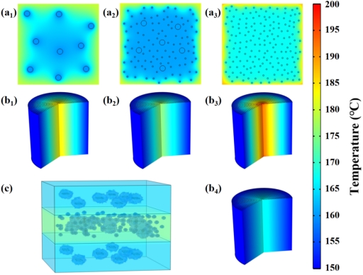 圖5 a1-a3) PEI基復(fù)合材料中間層的二維溫度分布模擬;b1-b4) PEI基復(fù)合材料繞卷電容器后內(nèi)部溫度分布模擬;c) 2.5-2.5復(fù)合材料的三維溫度分布模擬