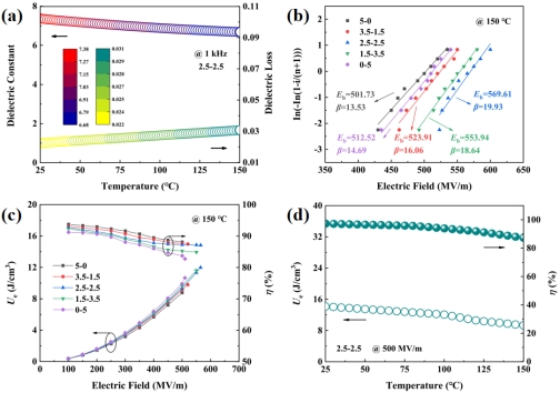 圖4 a) 2.5-2.5復(fù)合材料介電性能與溫度的關(guān)系;三明治結(jié)構(gòu)PEI基復(fù)合材料150 ℃下的b) 威布爾分布和c) 儲能性能;d) 2.5-2.5復(fù)合材料儲能性能和溫度的關(guān)系