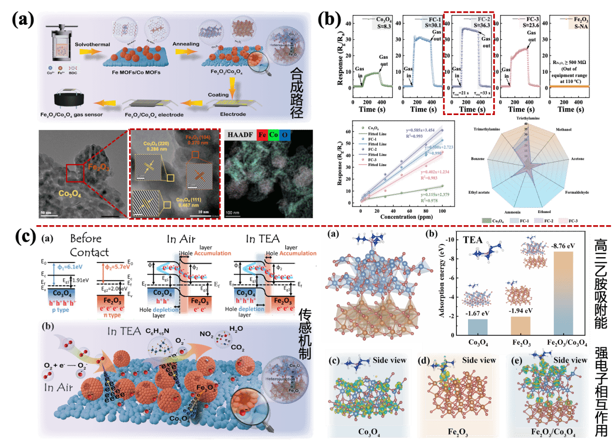 本研究聚焦“如何解決氣體傳感器在更低工作溫度下快速識別異味”這一全球關(guān)注的熱點難題,首次實現(xiàn)了Fe2O3納米球與Co3O4納米網(wǎng)原位構(gòu)建p-n異質(zhì)結(jié)結(jié)構(gòu),構(gòu)建出一種新型三維交聯(lián)納米復(fù)合材料。該傳感器材料能夠在比以往更低的工作溫度下(110 °C),實現(xiàn)對典型異味氣體三乙胺的高靈敏檢測,其響應(yīng)值是傳統(tǒng)材料的4倍以上,響應(yīng)/恢復(fù)時間也縮短至半分鐘以內(nèi),達(dá)到目前國際同類技術(shù)的領(lǐng)先水平。研究團(tuán)隊通過理論模擬和實驗分析,從微觀層面揭示了材料性能提升的根本原因,發(fā)現(xiàn)Fe2O3與Co3O4在界面處原位形成穩(wěn)定的異質(zhì)結(jié),有效促進(jìn)電荷分離與遷移,提升了氣體分子的吸附效率與表面反應(yīng)活性,從而實現(xiàn)了更快速、更靈敏的信號輸出。