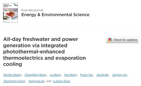 為此,陜西科技大學(xué)材料科學(xué)與工程學(xué)院“光熱材料的功能化調(diào)控與應(yīng)用”創(chuàng)新團(tuán)隊(duì)王成兵教授聯(lián)合北京航空航天大學(xué)趙立東教授團(tuán)隊(duì)、蘭州交通大學(xué)耿中榮教授,在能源環(huán)境領(lǐng)域頂級(jí)期刊《Energy & Environmental Science》(IF = 32.5) 上發(fā)表了題為“All-day freshwater and power generation via integrated photothermal-enhanced thermoelectrics and evaporation cooling”(基于集成光熱增強(qiáng)熱電技術(shù)與蒸發(fā)冷卻的全天候淡水與電力聯(lián)產(chǎn)系統(tǒng))的突破性研究成果。該研究成功構(gòu)建了一種全天候水—電聯(lián)產(chǎn)系統(tǒng),有效克服了上述技術(shù)瓶頸。