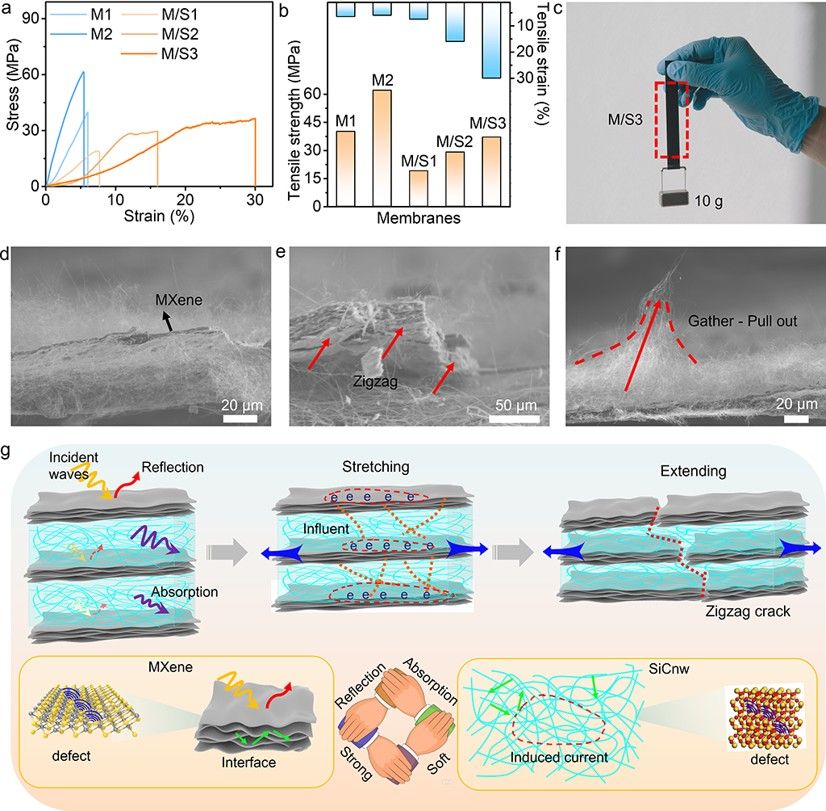圖4 a) 復合薄膜的應力-應變曲線;b) 復合薄膜的拉伸強度和應變;c) 承受10 g重量的M/S3復合薄膜的照片;d) M/S3復合薄膜的斷裂行為;e) MXene層的鋸齒狀階梯狀裂紋區(qū)域;f) SiCnw三維網(wǎng)絡的聚集-拔出;g) M/S3復合薄膜的拉伸、斷裂和電磁屏蔽機制