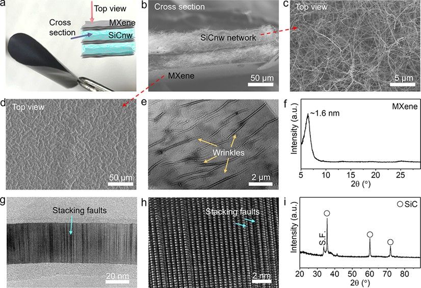 圖2 a) MXene/SiCnw膜的數(shù)碼照片和模型;b) 具有層狀雙電容器結構的MXene/SiCnw膜的橫截面SEM圖像;c) SiCnw三維網(wǎng)絡的SEM圖像;d) MXene膜的頂視圖;e) 帶有褶皺的MXene納米片的TEM圖像;f) MXene膜的XRD圖譜;g) 具有堆垛層錯的SiCnw的TEM圖像;h) SiCnw的高分辨率TEM圖像;i) SiCnw網(wǎng)絡的XRD圖譜