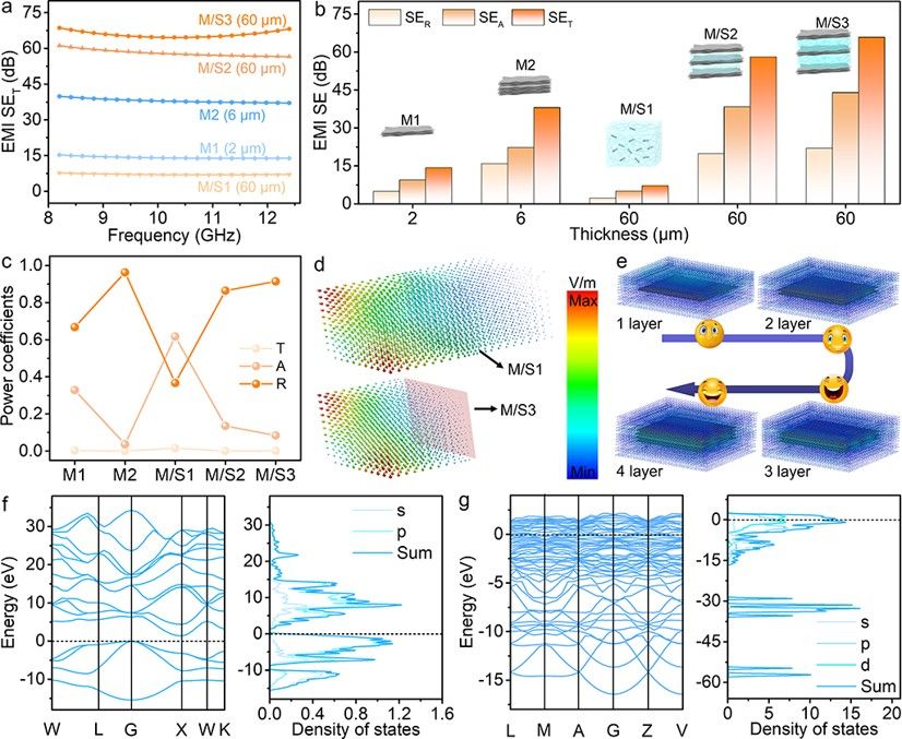 圖3 a) 復合薄膜的X波段電磁屏蔽效率;b) 復合薄膜的SET、SER和SEA的平均值;c)復合薄膜的R、A和T的功率系數(shù);d)樣品的模擬屏蔽效能;e) 不同電容器結構的復合薄膜對電磁波的影響;f) 含缺陷SiC的能帶結構和態(tài)密度;g) MXene/SiC能帶結構和態(tài)密度