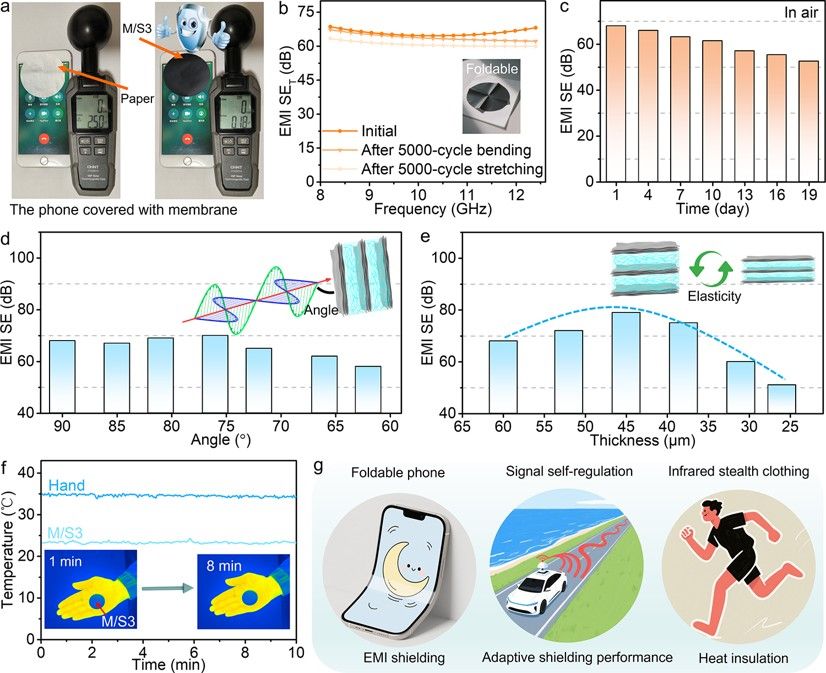 圖5 a) M/S3膜的屏蔽應用;b) M/S3膜拉伸彎曲后屏蔽性能的變化;c) M/S3膜隨時間的性能趨勢;d) 不同角度和e) 不同壓縮厚度下M/S3膜的電磁干擾屏蔽性能;f) 隨時間變化的紅外圖像;g) M/S3膜的潛在應用