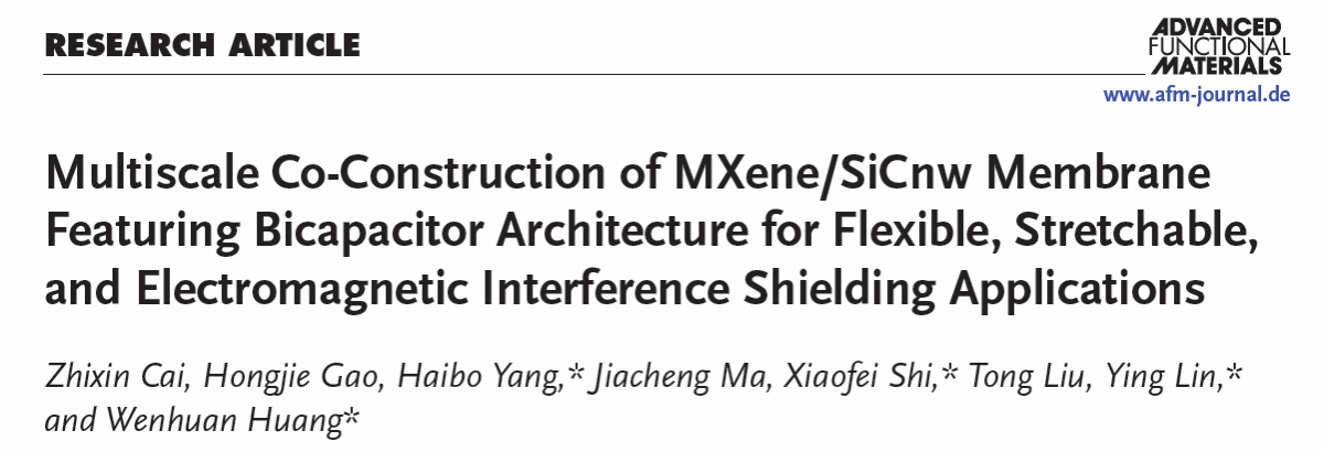 近日,材料科學與工程學院楊海波教授團隊,在國際頂級期刊《Advanced Functional Materials》(IF:19)上發(fā)表了題為“Multiscale Co-Construction of MXene/SiCnw Membrane Featuring Bicapacitor Architecture for Flexible, Stretchable, and Electromagnetic Interference Shielding Applications”的研究論文。陜西科技大學楊海波教授、林營教授、黃文歡教授和中國建筑材料科學研究總院有限公司石曉飛高級工程師為文章共同通訊作者,陜西科技大學材料學院博士后蔡志新為文章第一作者,陜西科技大學為第一通訊單位。