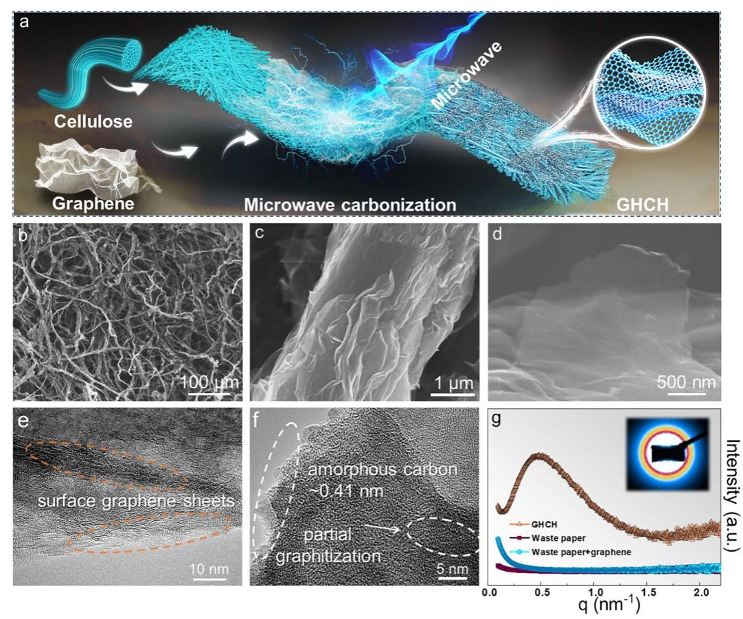 傳統(tǒng)碳化法制備碳材料面臨能耗高、效率低的瓶頸。本研究采用微波碳化技術,利用石墨烯微反應器,在短短 10 秒內快速碳化廢紙,制備出一種由石墨烯與硬碳構成的異質結構碳質電極。通過結合實驗證據與有限元模擬,證實了一種新穎的微波碳化機理:石墨烯吸收微波產生高頻等離子體電磁波,該電磁波“催化”樣品快速吸收微波,導致樣品內部發(fā)生電擊穿從而引發(fā)初步碳化。利用這種超快碳化技術制備的碳質材料作為鉀離子電池負極,展現(xiàn)出高可逆容量和優(yōu)異的循環(huán)穩(wěn)定性??傊?,微波碳化為合成高性能碳基電極提供了一條可持續(xù)且高效的途徑。https://doi.org/10.1002/adfm.202508032