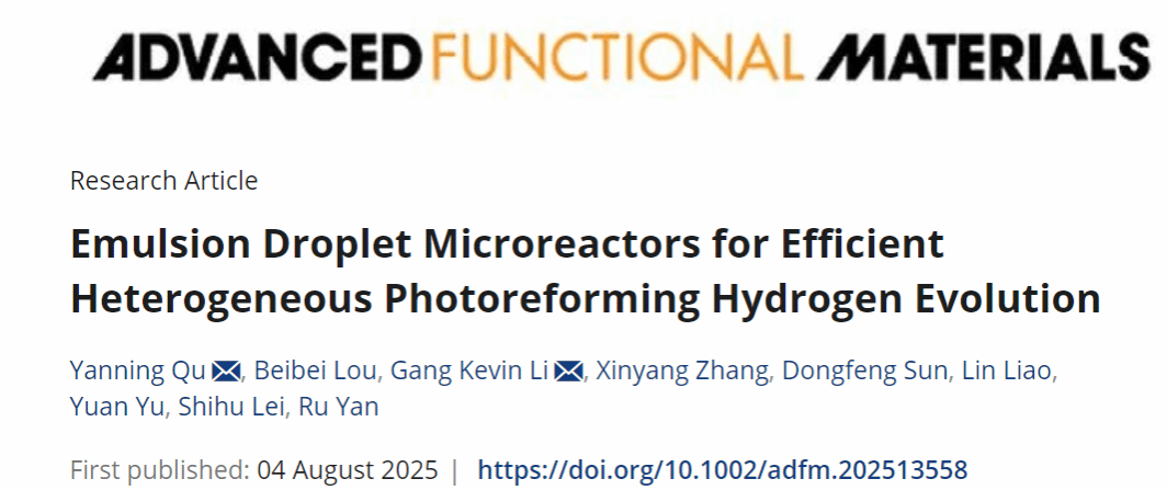 論文詳細信息:Y. Qu, B. Lou, G. Li, X. Zhang, D. Sun, L. Liao, Y. Yu, S. Lei, R. Yan, Emulsion droplet microreactors for efficient heterogeneous photoreforming hydrogen evolution, Advanced Functional Materials, 2025, e13558. DOI: 10.1002/adfm.202513558.