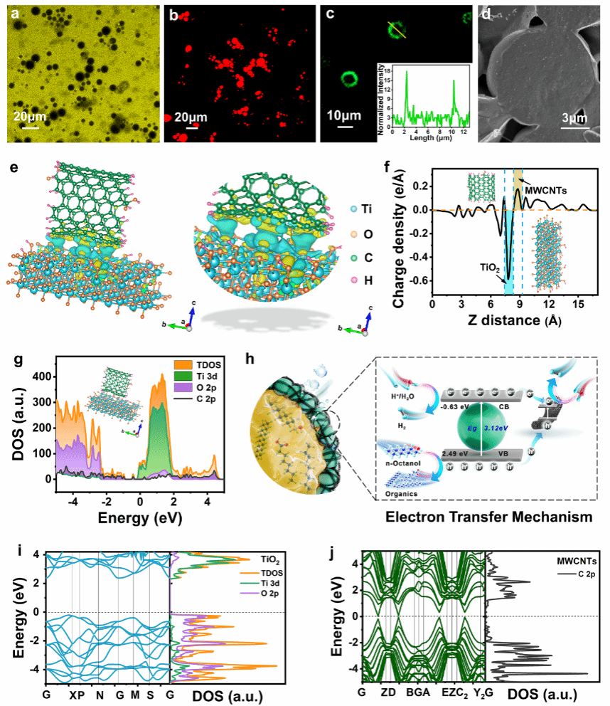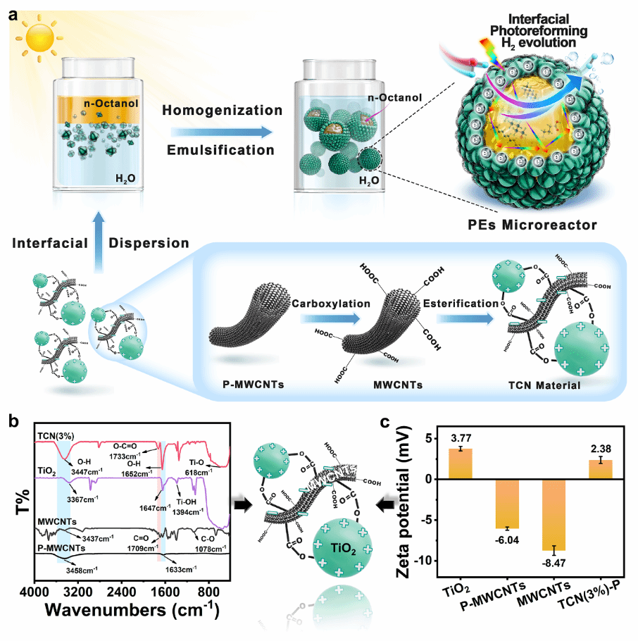 近日,陜西科技大學屈彥寧博士與墨爾本大學Gang Kevin Li(李剛)教授合作在國際知名期刊《Advanced Functional Materials》(一區(qū)TOP, IF=19)上發(fā)表了題為“Emulsion droplet microreactors for efficient heterogeneous photoreforming hydrogen evolution”的研究論文。陜西科技大學為第一作者及第一通訊作者單位。該研究開發(fā)出由TiO2/MWCNTs復合材料穩(wěn)定的Pickering乳液微反應體系,用于液-液非均相界面光催化重整制氫。采用該材料穩(wěn)定的Pickering乳液,其最優(yōu)產(chǎn)氫量較單一水相TiO2提升了9.93倍, 表觀量子產(chǎn)率AQY是油水混合體系的5.2倍。本研究為強化液-液非均相光重整反應及生物質(zhì)衍生物再利用提供了有利支持。