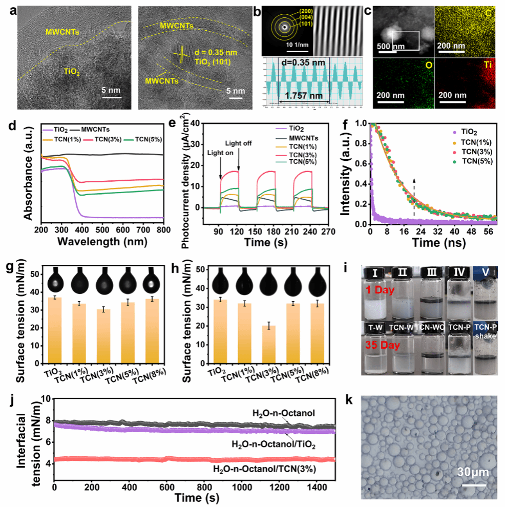 為了突破上述問題,本研究開發(fā)出由TiO2/MWCNTs穩(wěn)定的Pickering乳液體系,用于界面光催化重整產(chǎn)氫。該體系顯著改善了基底材料間的結合性、乳液穩(wěn)定性及活性物種傳輸效率。TiO2與MWCNTs通過靜電吸引和酯化作用相結合,有效抑制了反應過程中基底粒子的脫落;通過優(yōu)化條件,在降低界面張力的同時保障了乳液的穩(wěn)定性;光生電子可有效地從TiO2定向轉(zhuǎn)移至MWCNTs,確保了光生載流子的有效分離。與油-水單相及混合相體系相比,該Pickering乳液的光催化重整產(chǎn)氫效率顯著提升。該研究為強化液-液非均相體系光催化重整反應提供了新思路。